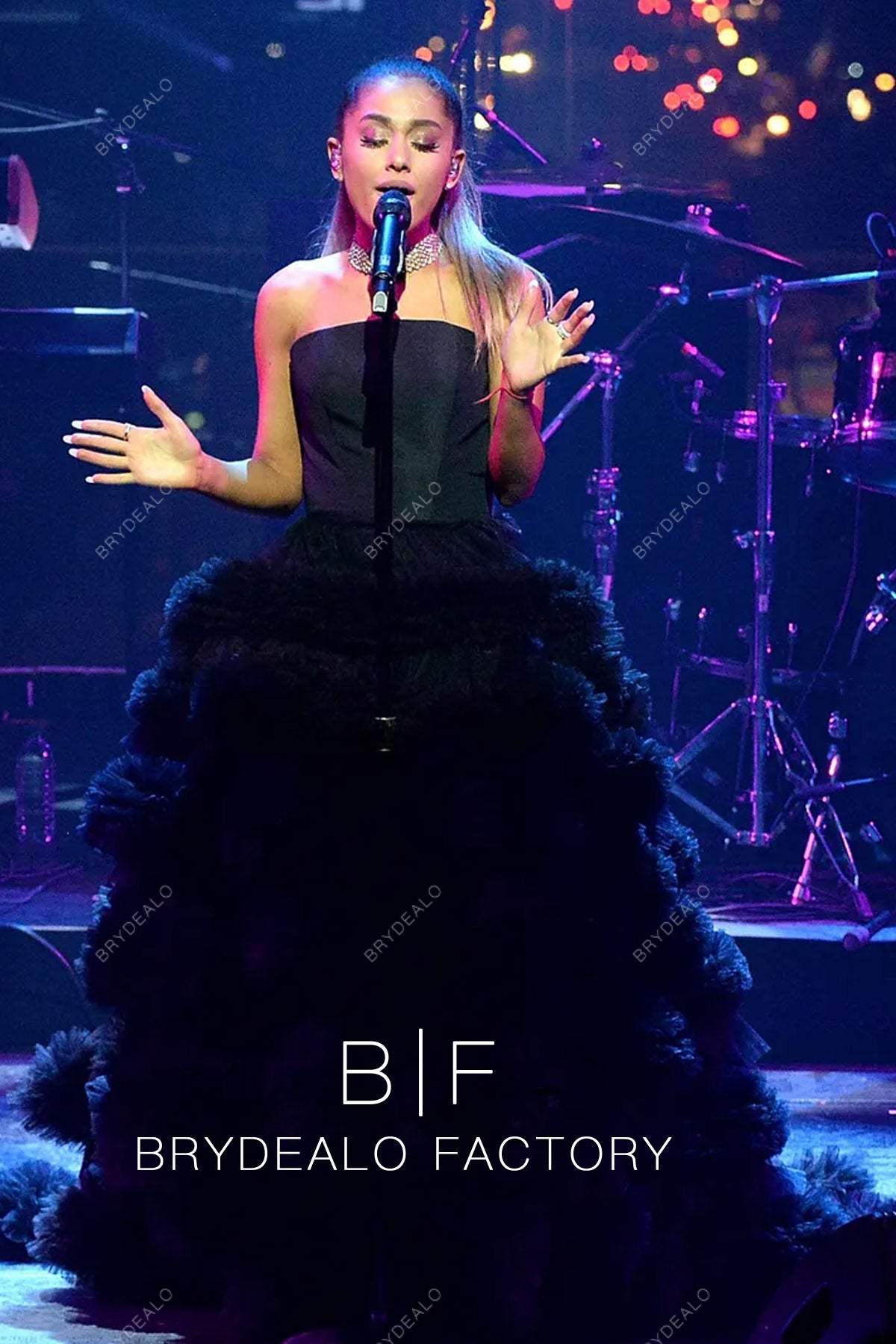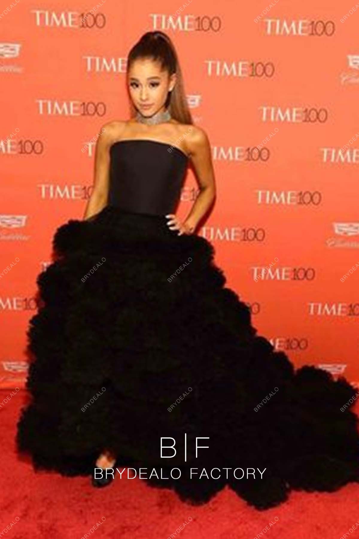 Ariana Grande 2016 Time 100 Gala Black Celebrity Red Carpet Dress features strapless straight across neck, tulle puffy A-line skirt with long train.