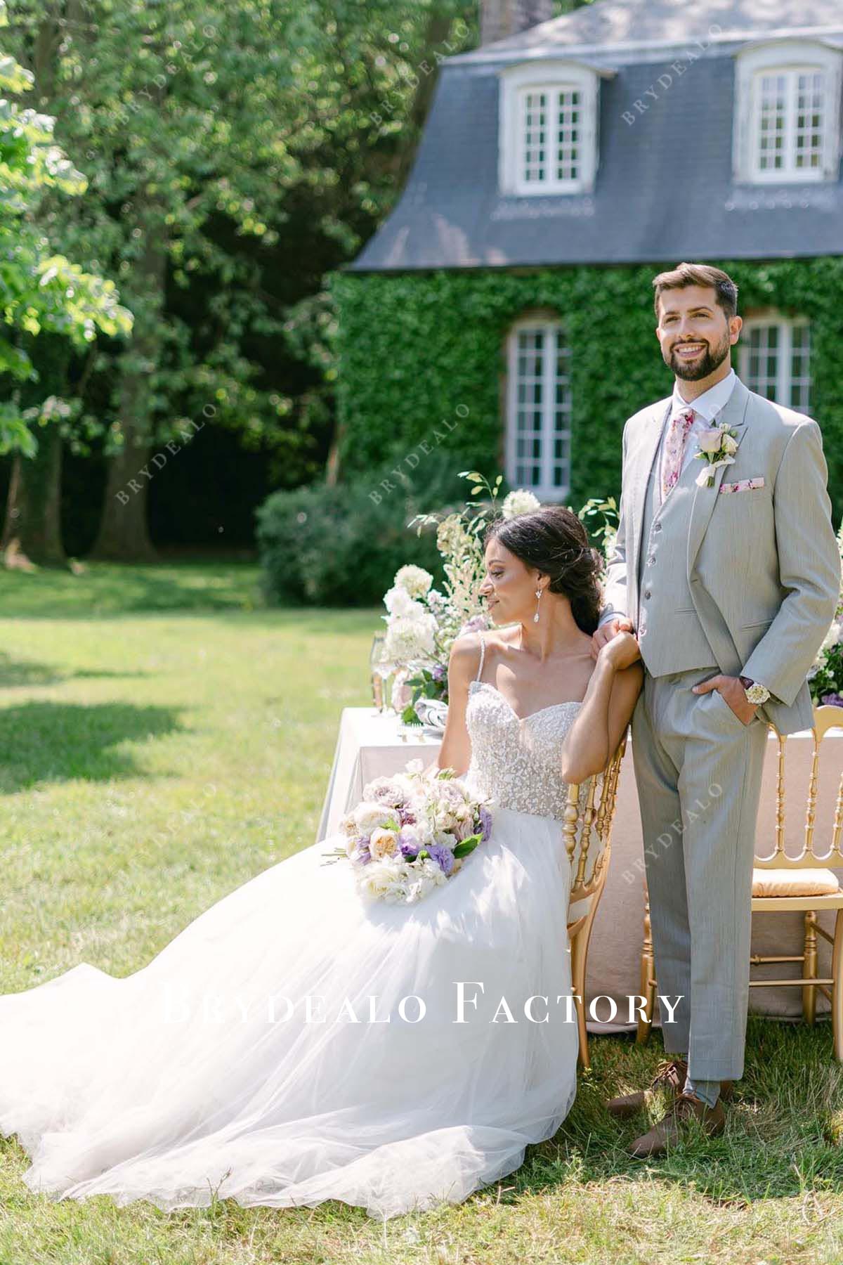 Walk down the aisle in elegance with this A-line wedding dress. Featuring a beaded bodice, delicate beaded straps, and a romantic sweetheart neckline with a graceful court train.