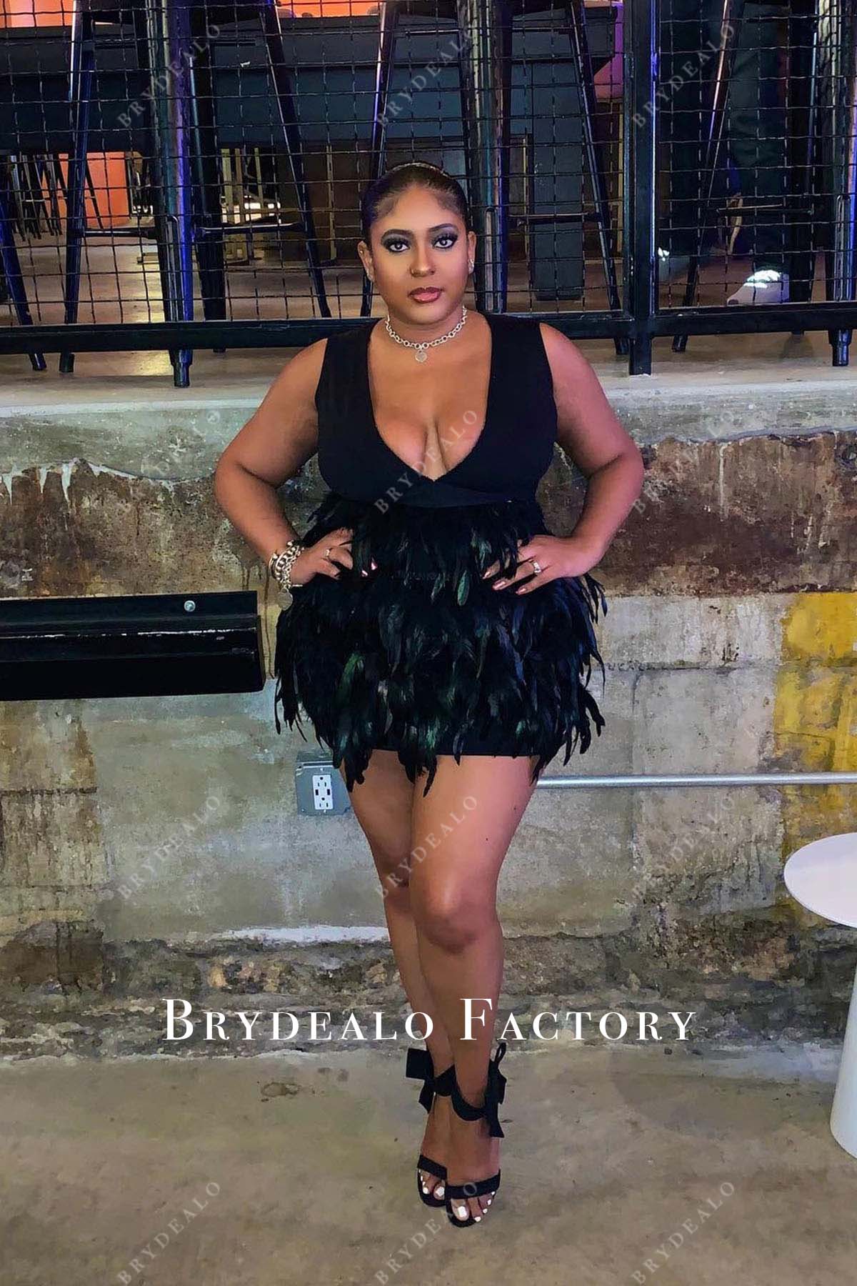 Turn heads at prom cocktail prom in this sleek black plus size mini bodycon dress. Featuring a sleeveless design and a daring plunging neckline, the standout feathered skirt adds bold texture and flair. Perfect for a glamorous and edgy look that will make you the center of attention at any special event.