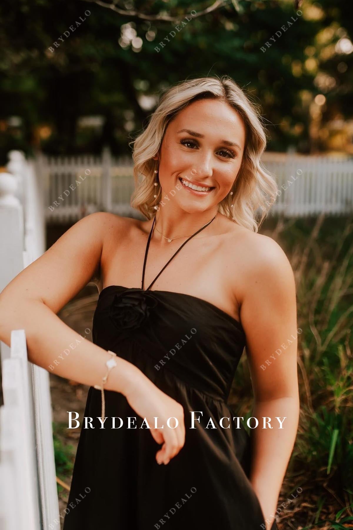 Stand out in this black short prom dress featuring spaghetti straps, a halter neckline, and stunning 3D floral details. The A-line silhouette adds a flirty touch, perfect for prom, homecoming, or any semi-formal event.