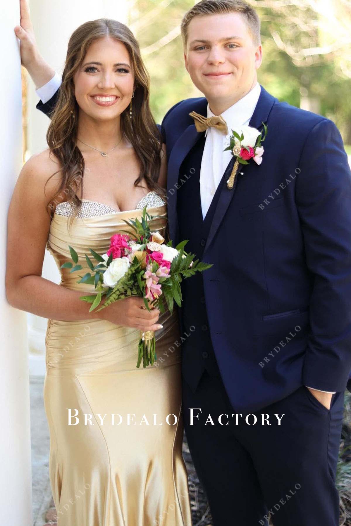 Glamour meets elegance in this champagne satin homecoming dress. Featuring a strapless sweetheart neckline adorned with sparkling rhinestones, a curve-hugging mermaid silhouette, and a dramatic long train, it’s perfect for proms, homecomings, or formal events.