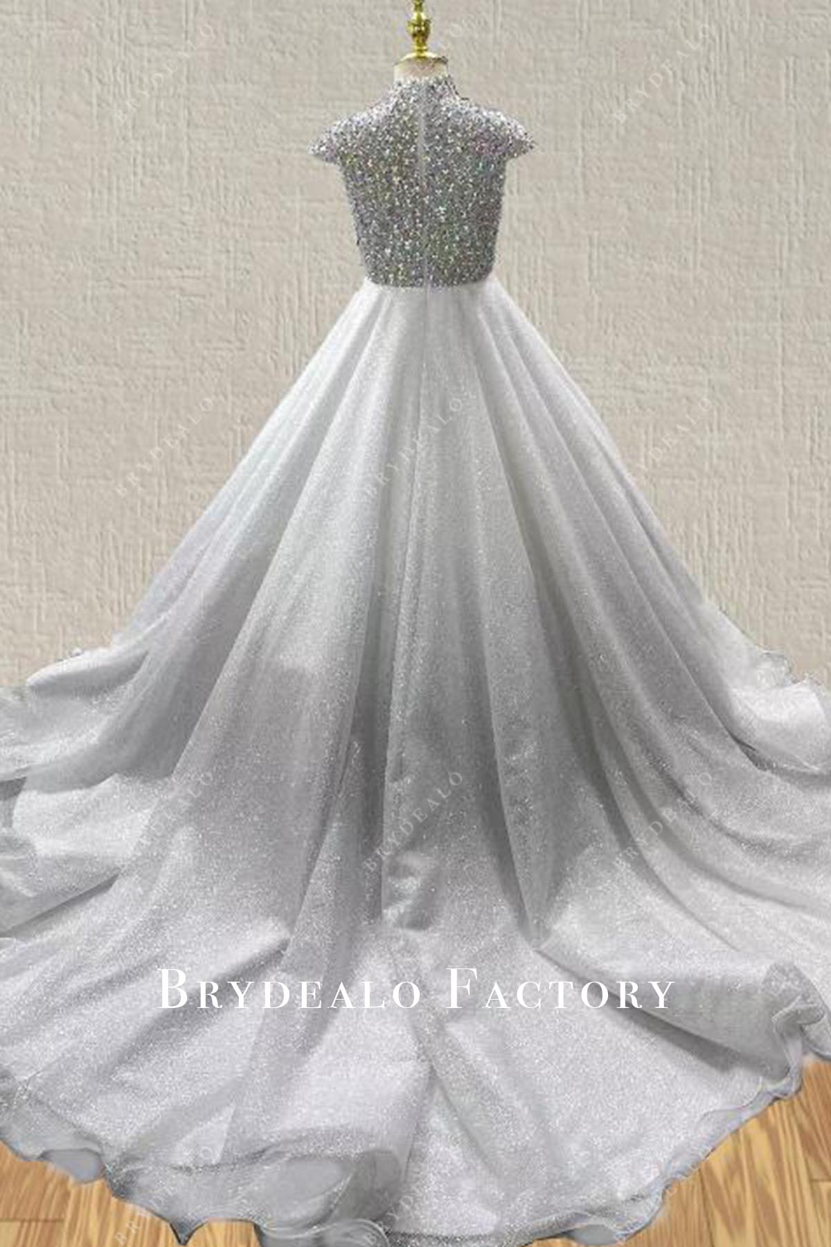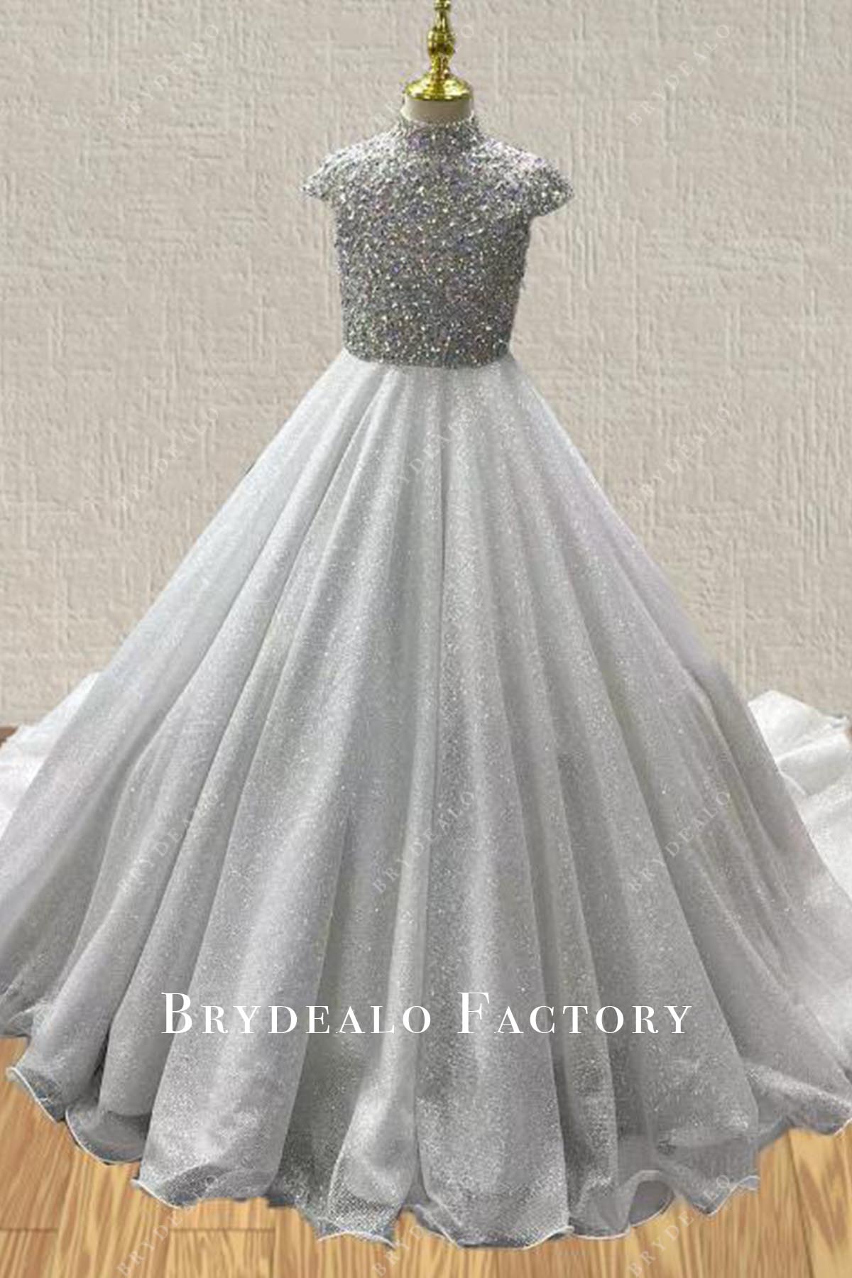 Sparkle with elegance in this stunning pageant dress! Featuring a crystal-embellished high neck, cap sleeves, and a glittering A-line skirt with a flowing court train, it creates a regal and breathtaking look.