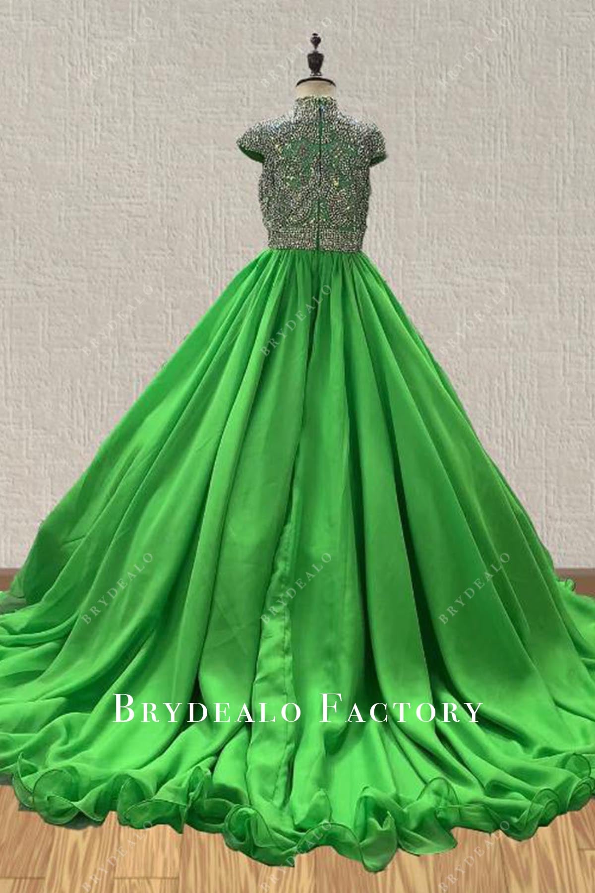 Shine bright in this emerald kids pageant dress! Designed with a high neck, cap sleeves, sparkling crystal details, and a graceful A-line court train, it’s the perfect blend of elegance and charm for your little star’s big moment.
