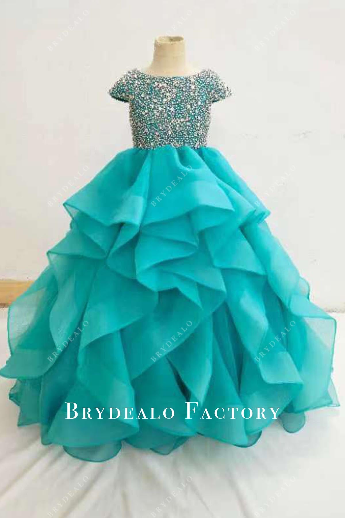 Dazzle the crowd in this crystal-embellished green pageant dress featuring elegant cap sleeves, a classic boat neck, ruffled A-line silhouette, and sweep train.