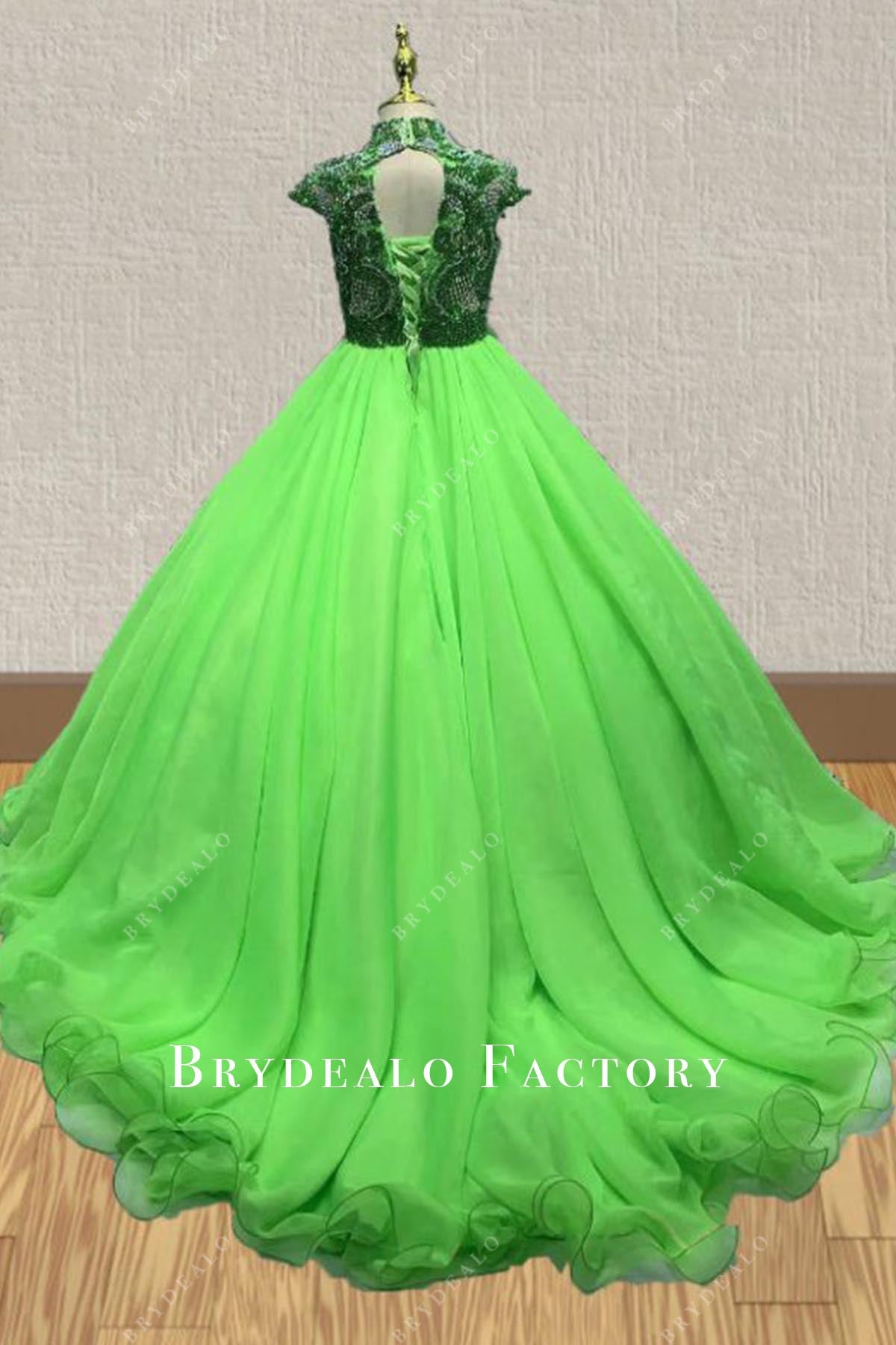Stand out on stage in this lime green Miss Teen pageant dress! Features a high neckline, sparkling crystal embellishments, elegant cap sleeves, and a flowing A-line silhouette with a graceful court train.
