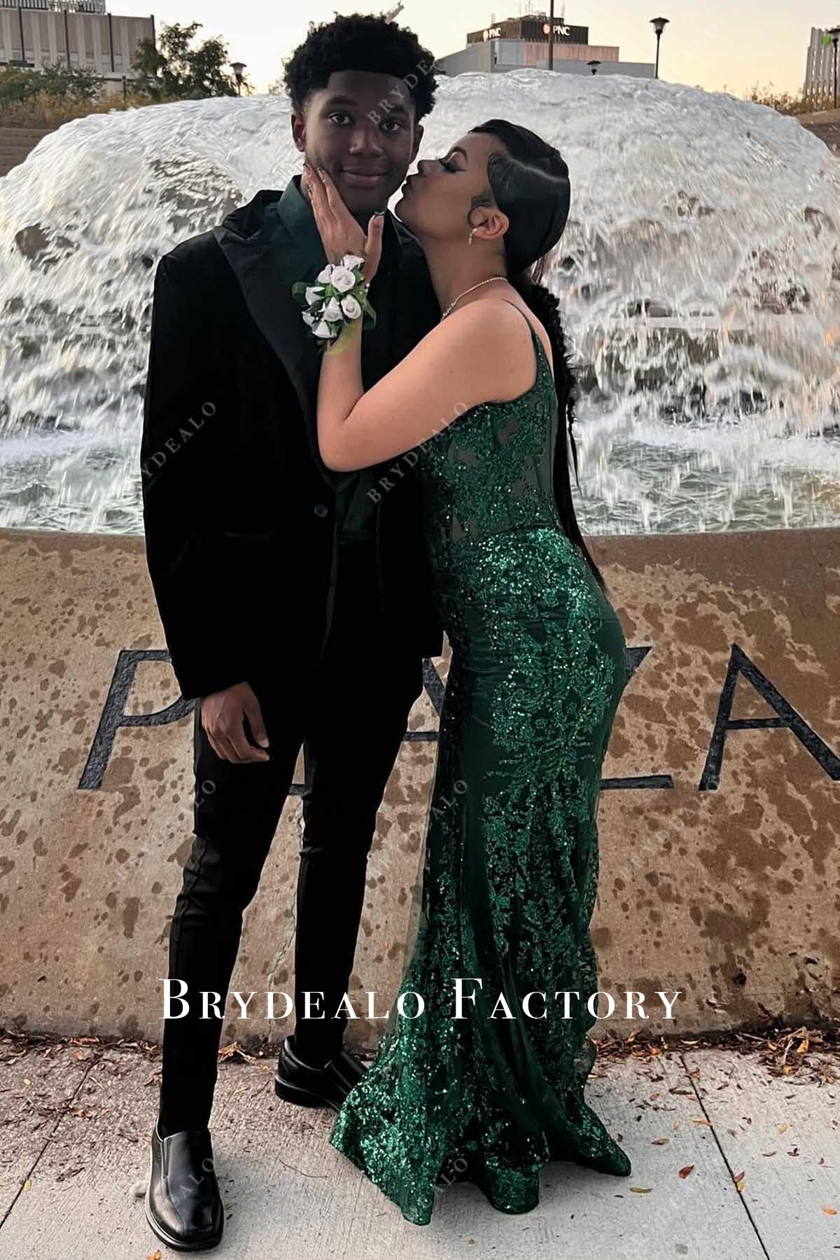Dark Green Glitter Lace Spaghetti Straps Mermaid Prom Dress