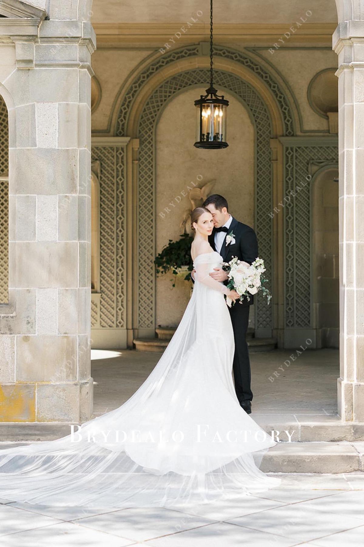 Say "I do" in style with this off-shoulder mermaid wedding dress. Features a straight-across neckline, sheer sleeves, long cape, and chapel train for a dramatic, elegant bridal look.