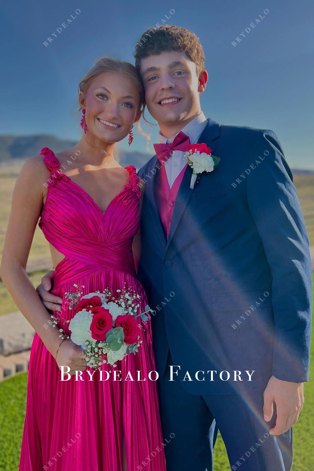Bloom with beauty in this fuchsia prom dress featuring 3D floral straps, a flattering V-neckline, pleated A-line skirt, and elegant floor-length design—perfect for a romantic, standout look.