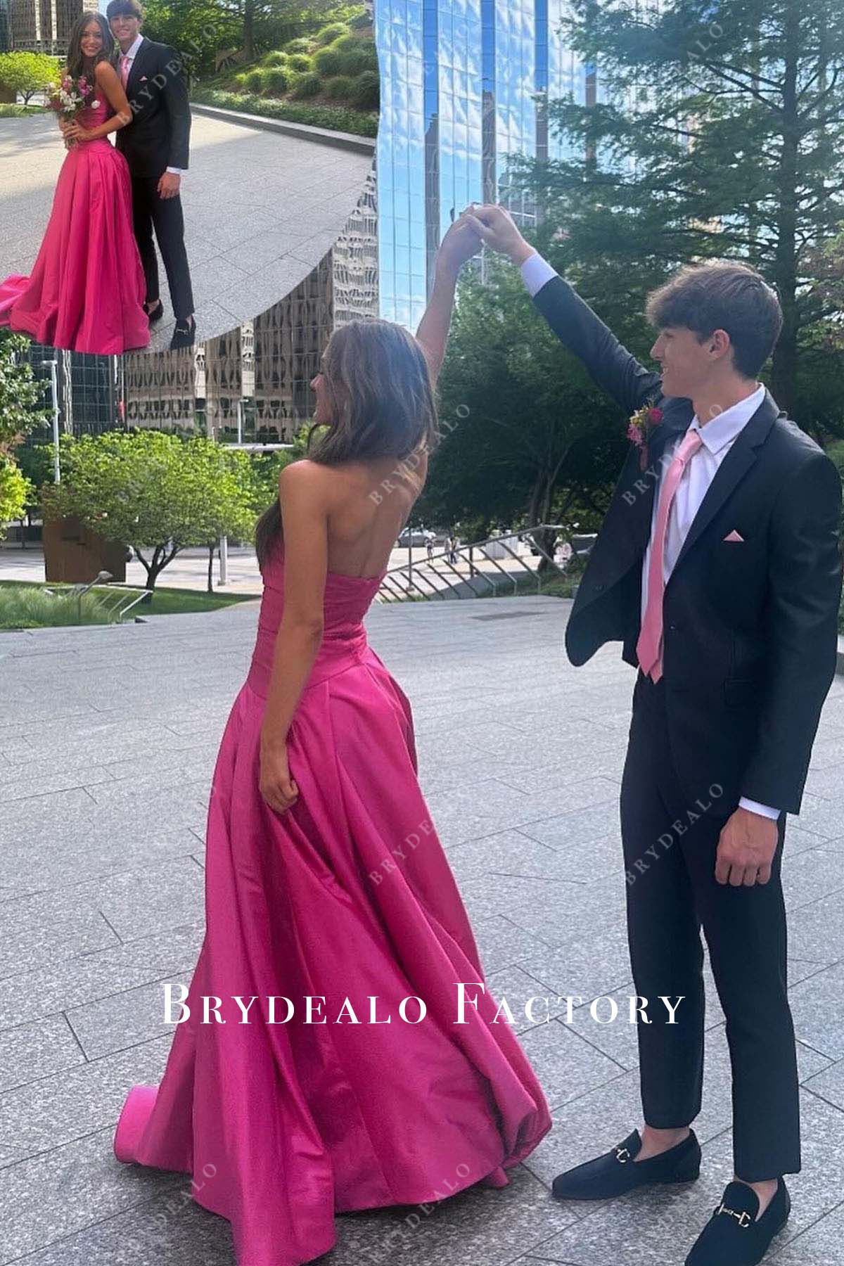 Make a bold statement with this fuchsia strapless homecoming dress. Featuring a straight neckline, pleated A-line silhouette, and a sweep train, it combines elegance with a modern edge. Perfect for homecoming, prom, or any special occasion.