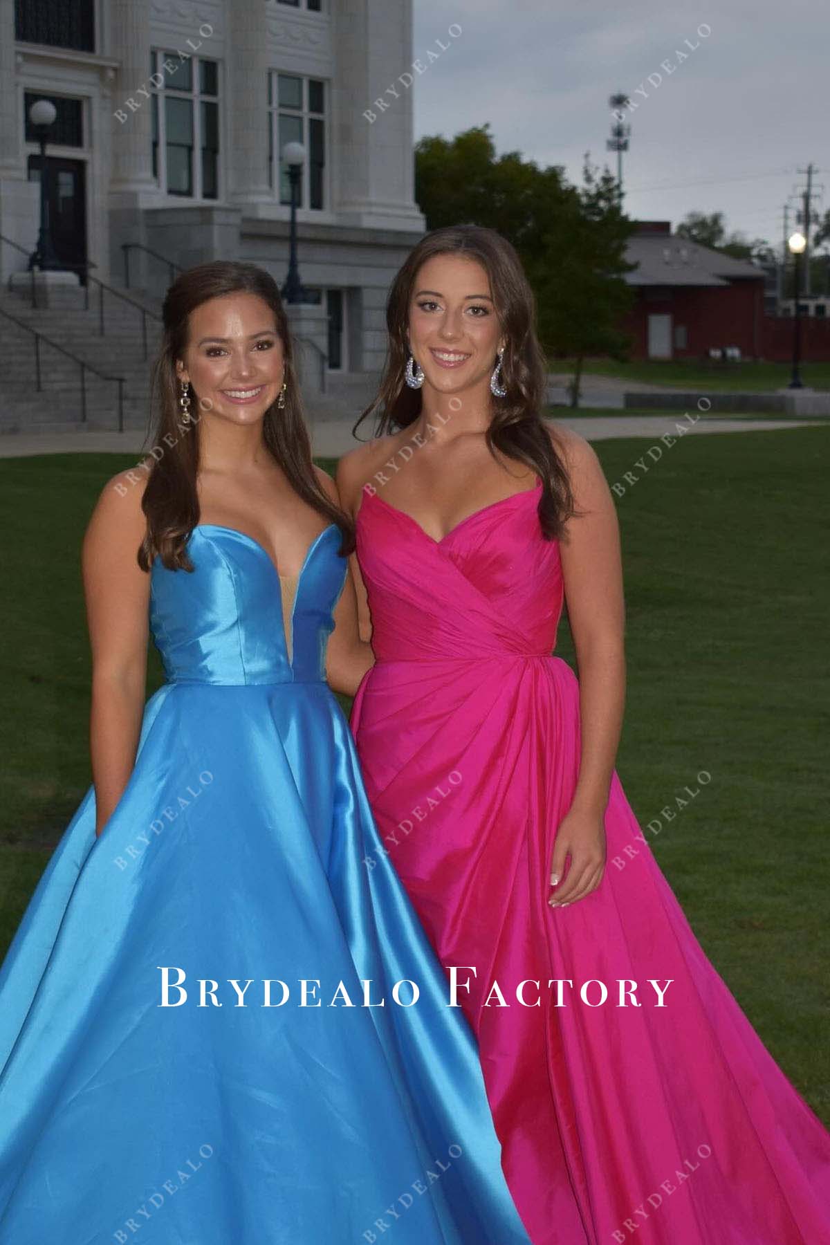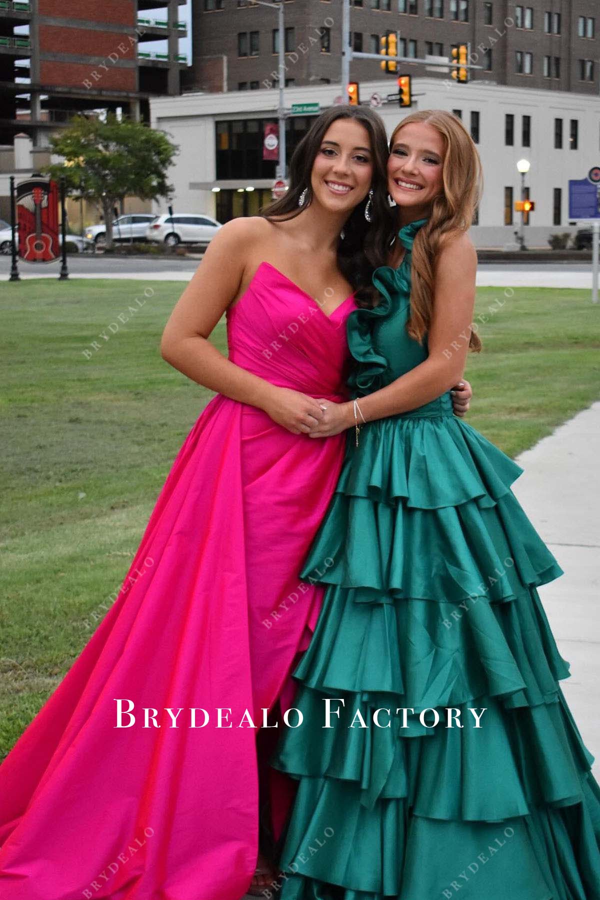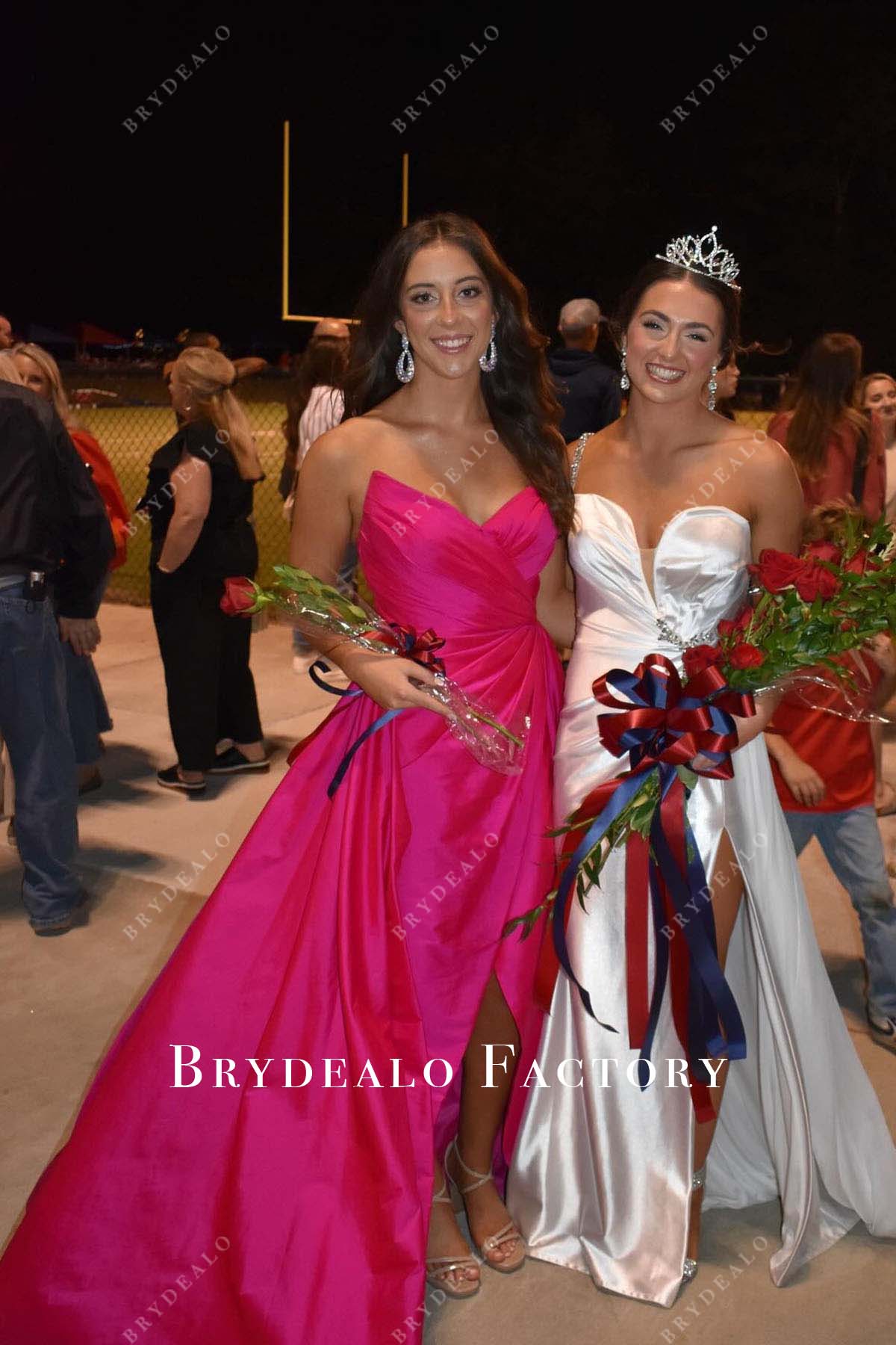Turn heads in this stunning fuchsia strapless gown. Featuring a pleated V-neck bodice, a dramatic slit skirt, and an elegant panel train, it’s the perfect choice for formal events.
