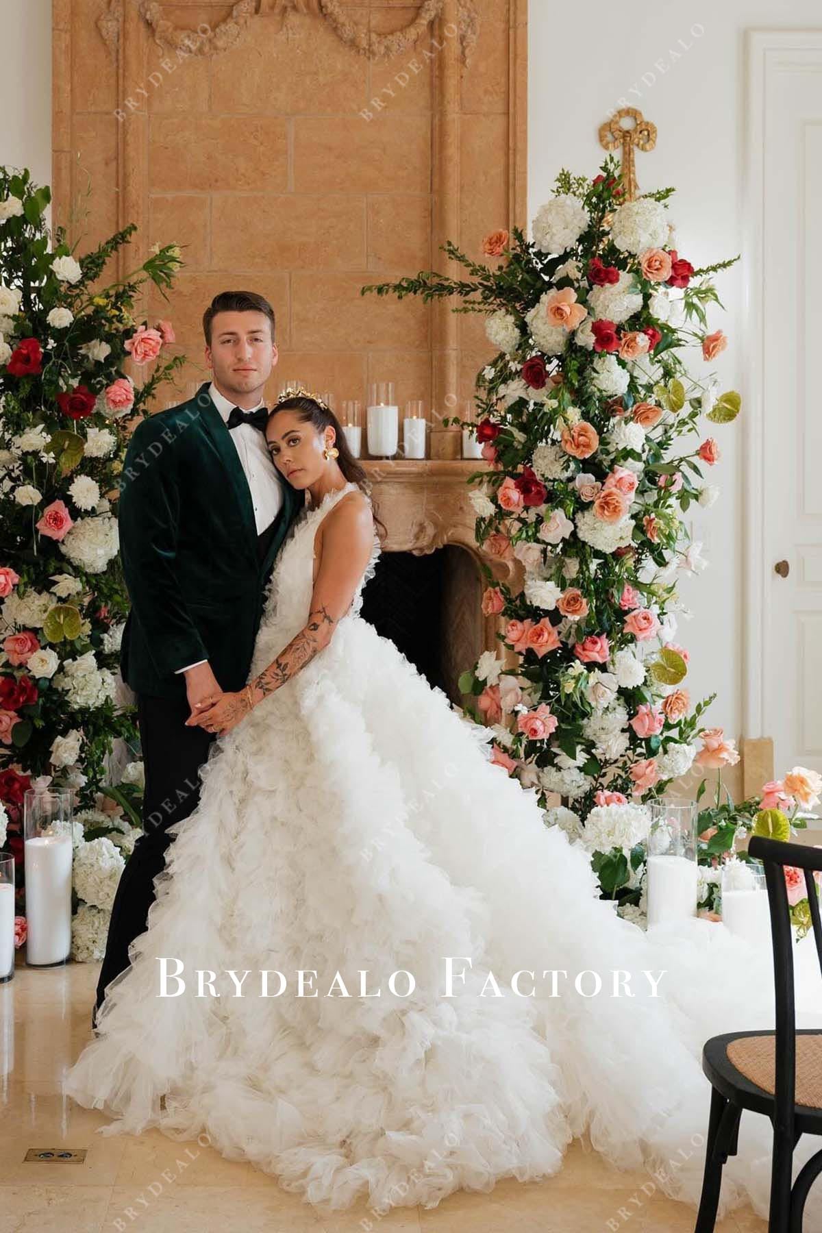 Walk down the aisle in style with this dramatic layers of soft ruffled tulle wedding dress. Featuring ruffled straps, a plunging neckline, and a voluminous A-line silhouette with a flowing chapel train.