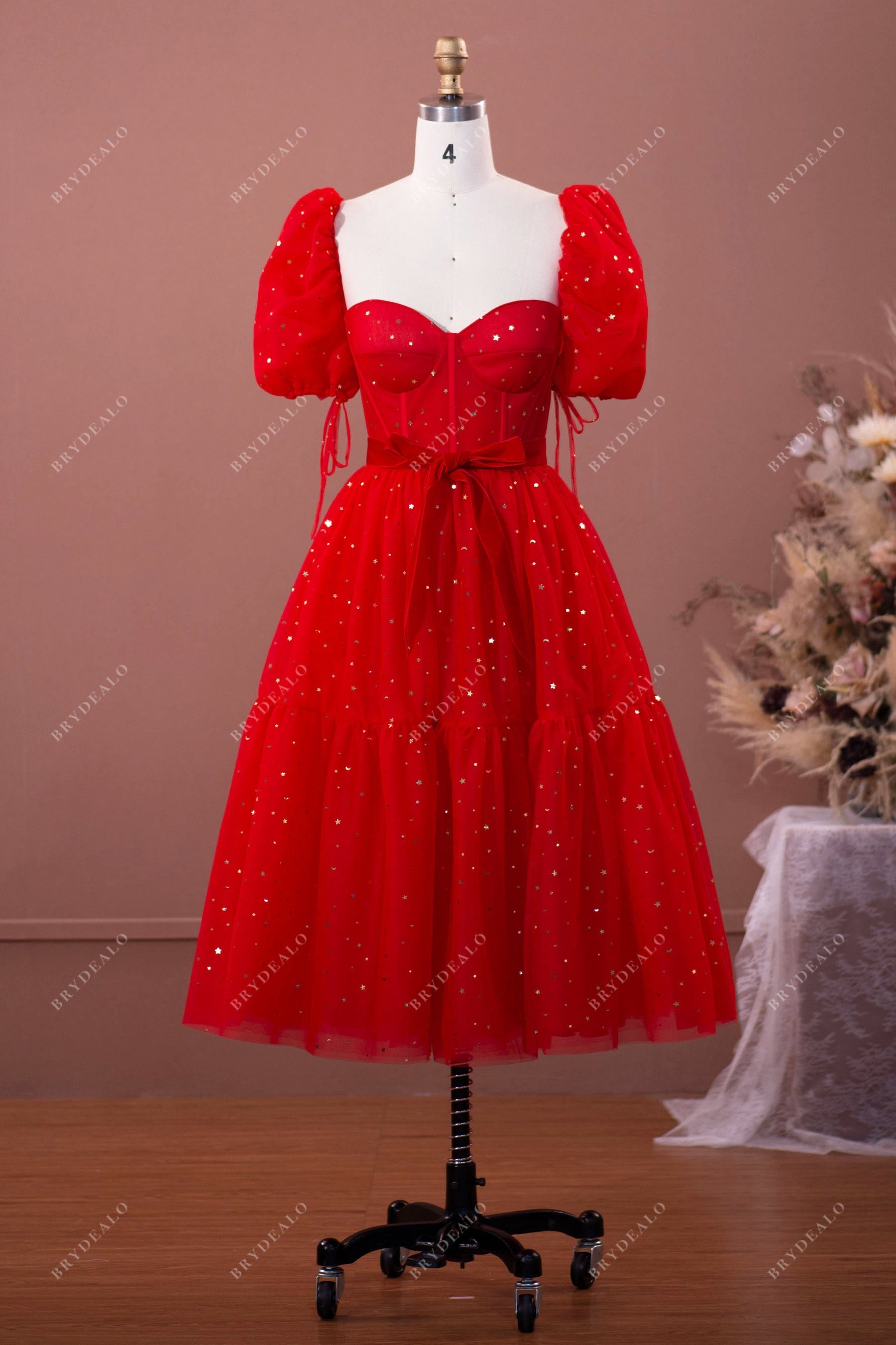 In Stock | Red Stars Bubble Sleeves Tea Length Prom Dress