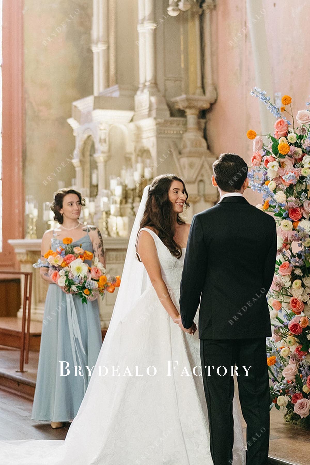 Timeless elegance meets modern charm in this jacquard wedding dress. Featuring wide straps, a square neckline, and a flattering A-line silhouette with a graceful court train—perfect for a romantic and refined bridal look.