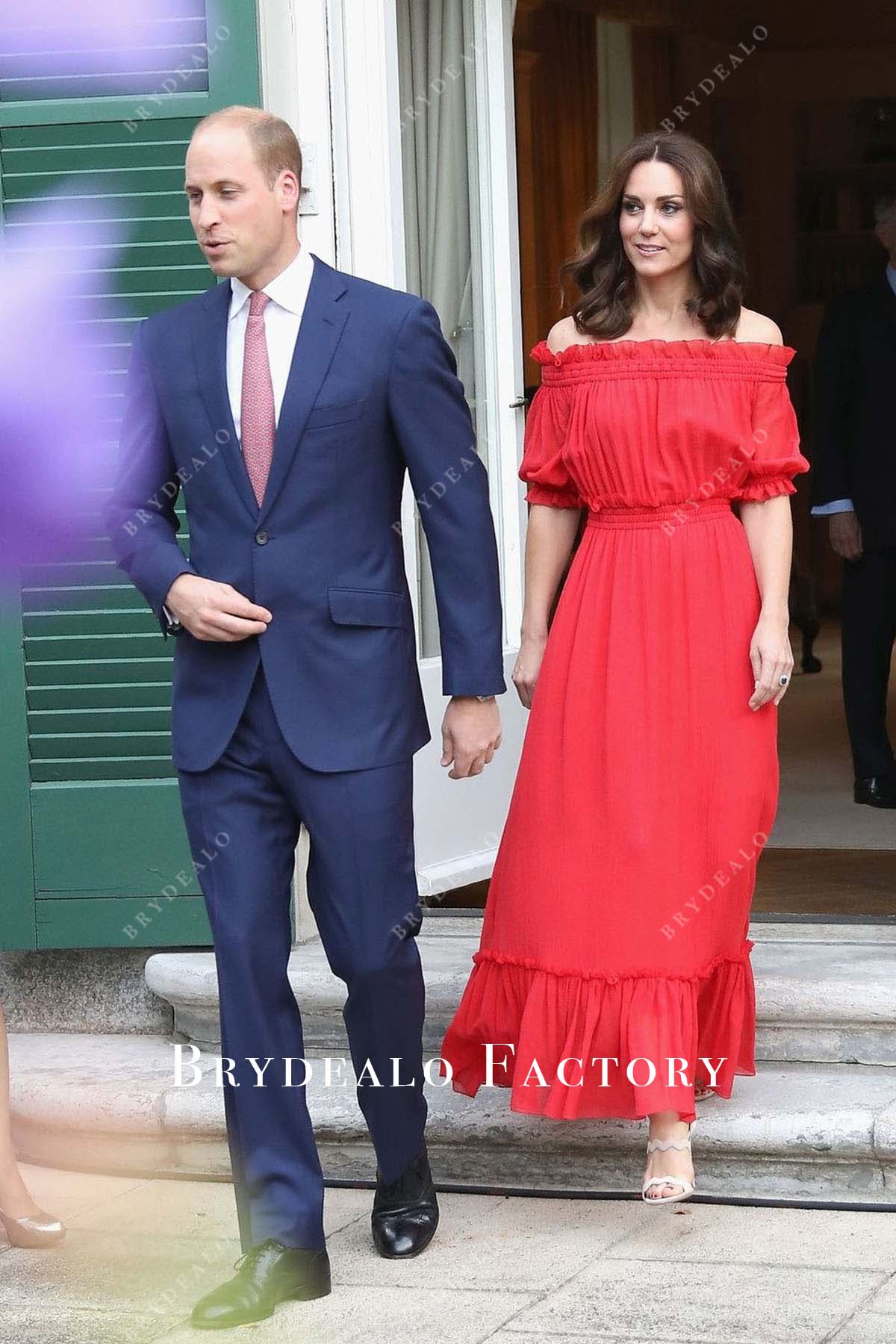 Kate Middleton wore this red maxi dress at the Queen's official birthday party 2017. Ruffled off shoulder half sleeve evening formal dress with ankle length A-line skirt.