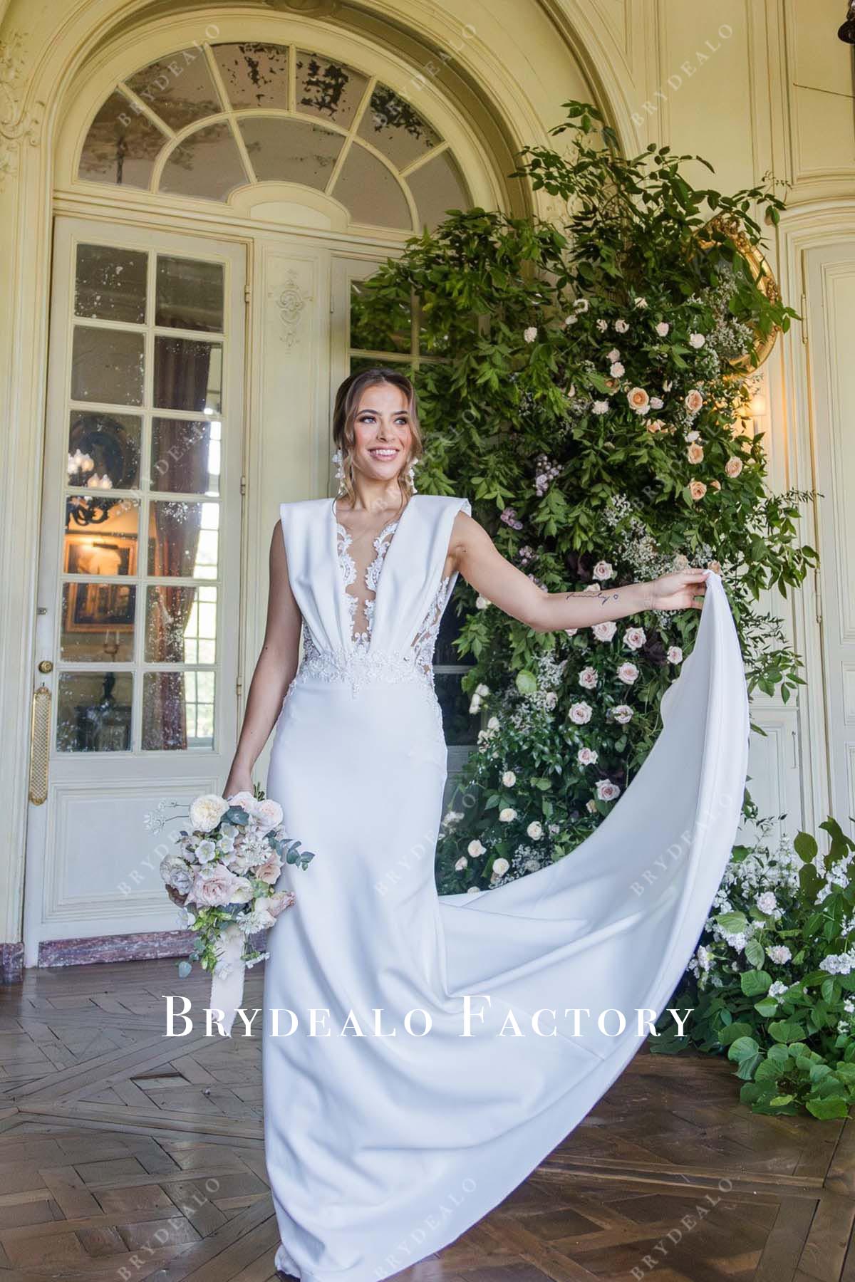 Elegance meets allure in this crepe mermaid wedding dress, featuring delicate lace appliques, a sleeveless design, plunging neckline, and a graceful court train.