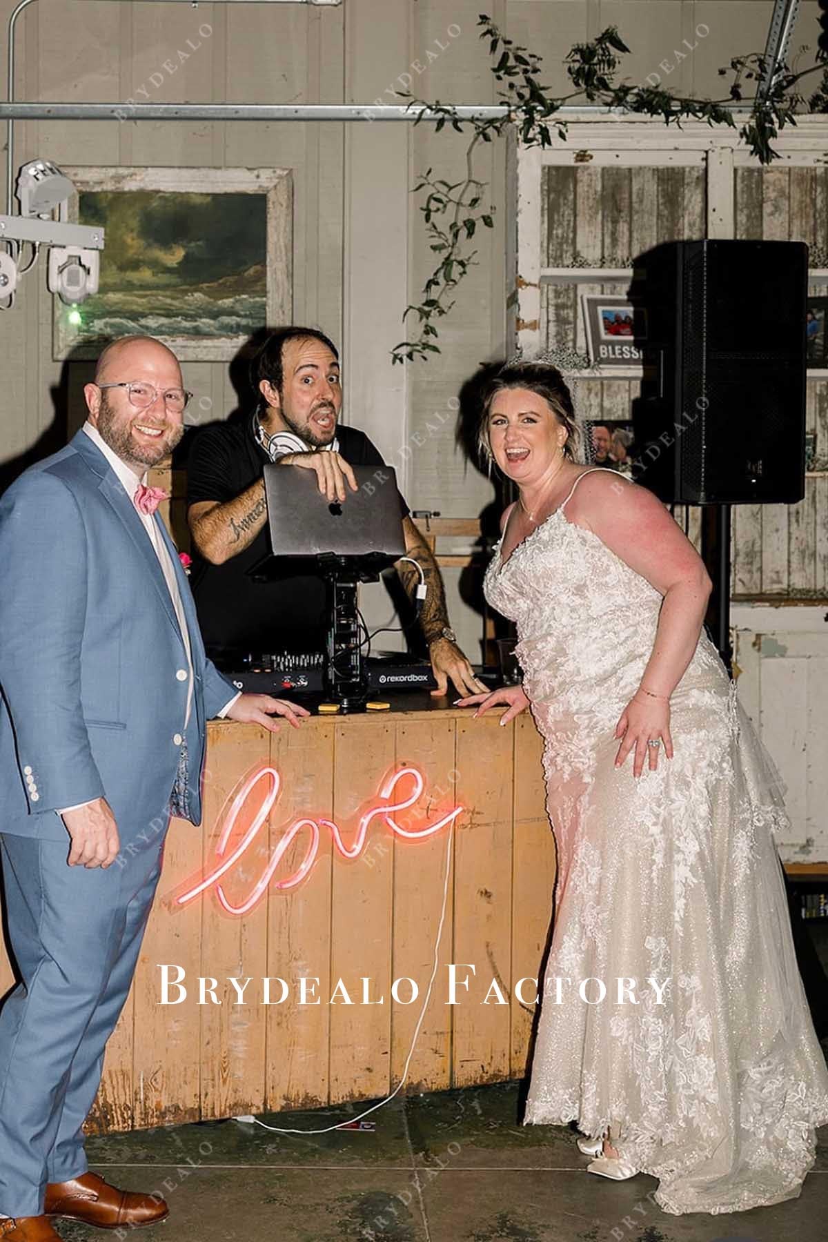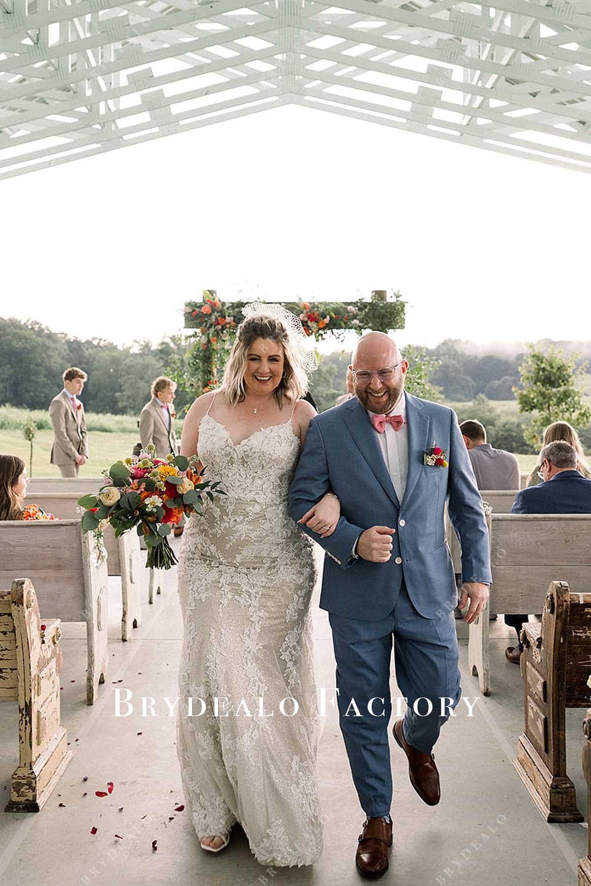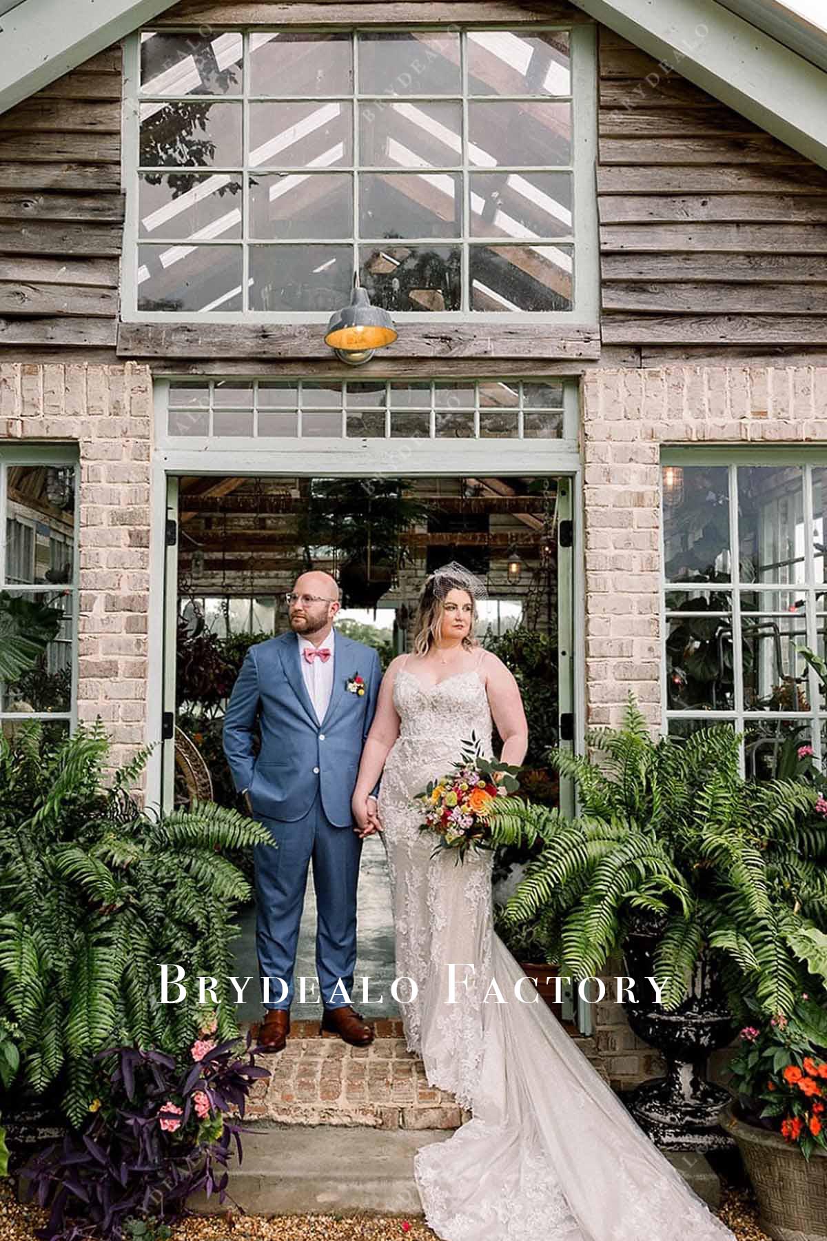 Say "I do" in timeless style with this lace mermaid wedding dress, featuring delicate spaghetti straps, a flattering V-neckline, and a flowing chapel train for graceful drama.