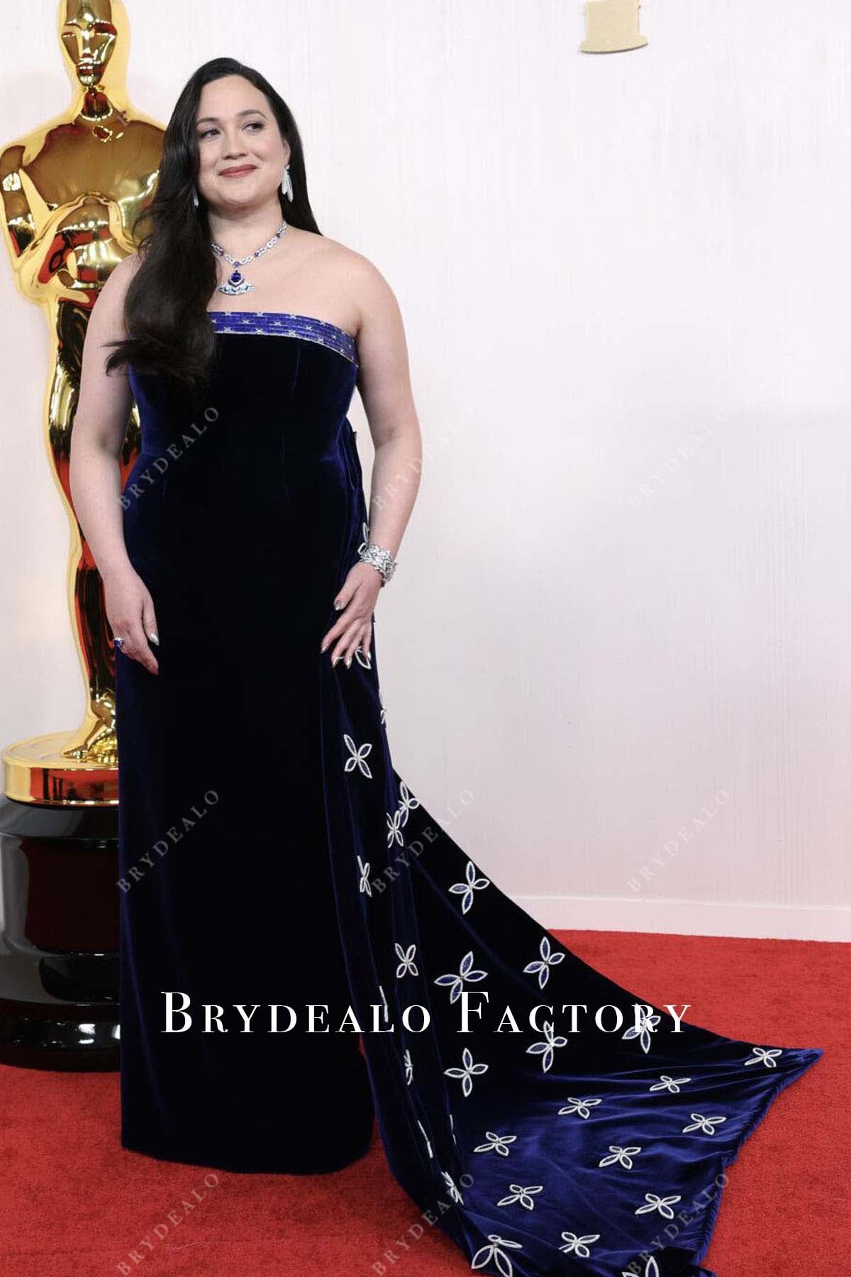 Lily Gladstone sparkled at the 2024 Oscars red carpet in a plus size navy blue strapless velvet floor length sheath gown with panel train, blue straight across neck, that radiated glamour and sophistication.