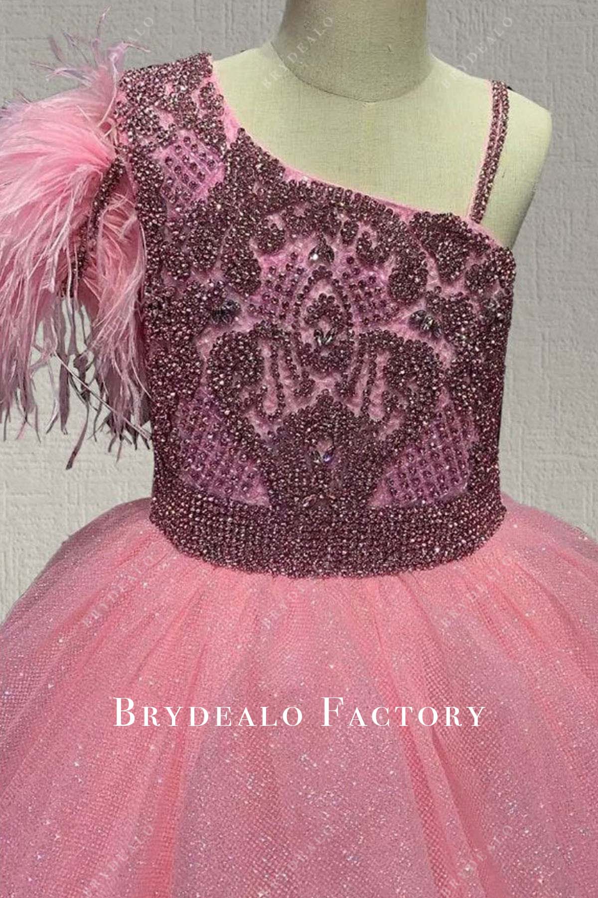 Shine bright in this peach glitter kids pageant gown. Featuring an asymmetrical neckline, a feathered one-shoulder bodice adorned with rhinestones, and puffy A-line skirt with tiered ruffles, it’s perfect for creating a dazzling and memorable look.