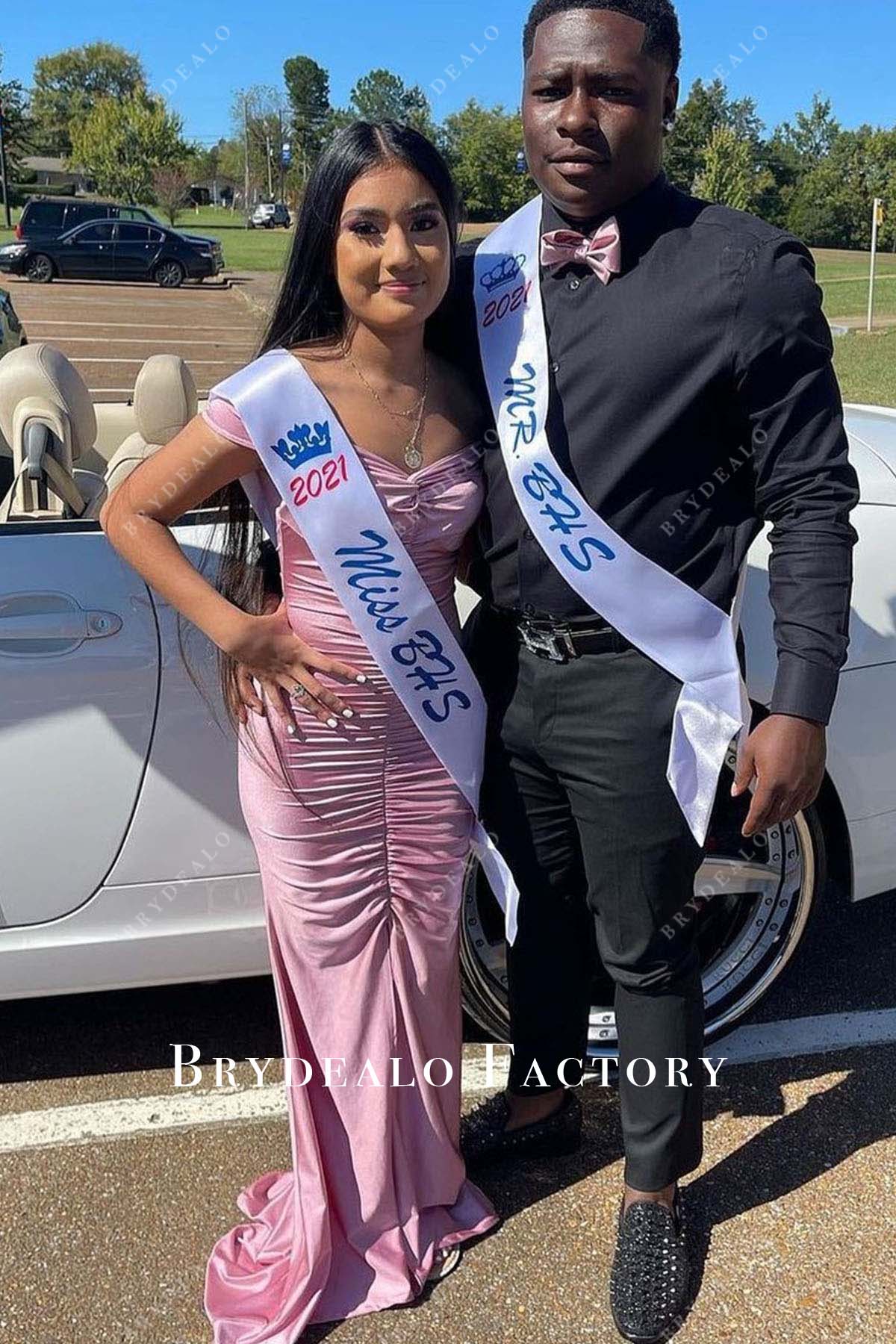 Turn heads at prom in this stunning pink off-shoulder dress. Featuring a flattering V-neckline and elegant pleated design, the floor-length gown flows into a graceful sweep train. This dress offers a romantic and timeless look, perfect for making an unforgettable entrance on your special night.