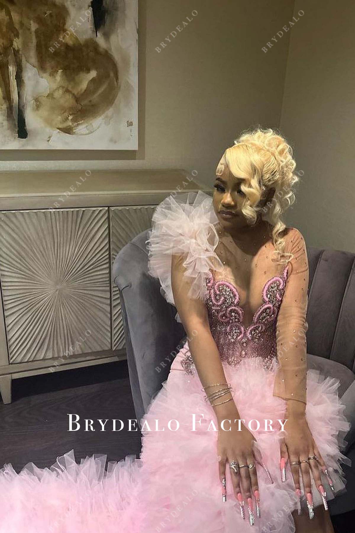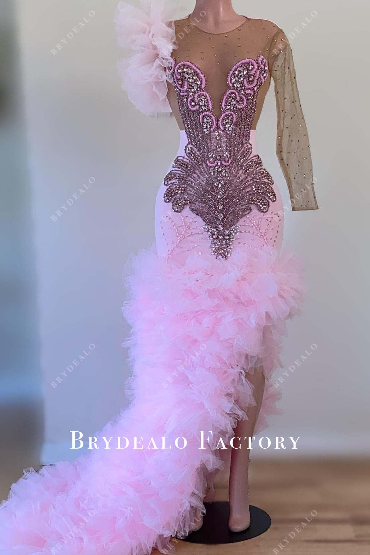 Turn heads in this pink tulle prom dress featuring a rhinestone-adorned sheer bodice with a unique one-sleeve design. The thigh-high slit and flowing long train add elegance and drama, creating a glamorous look perfect for making a bold statement on your special night.