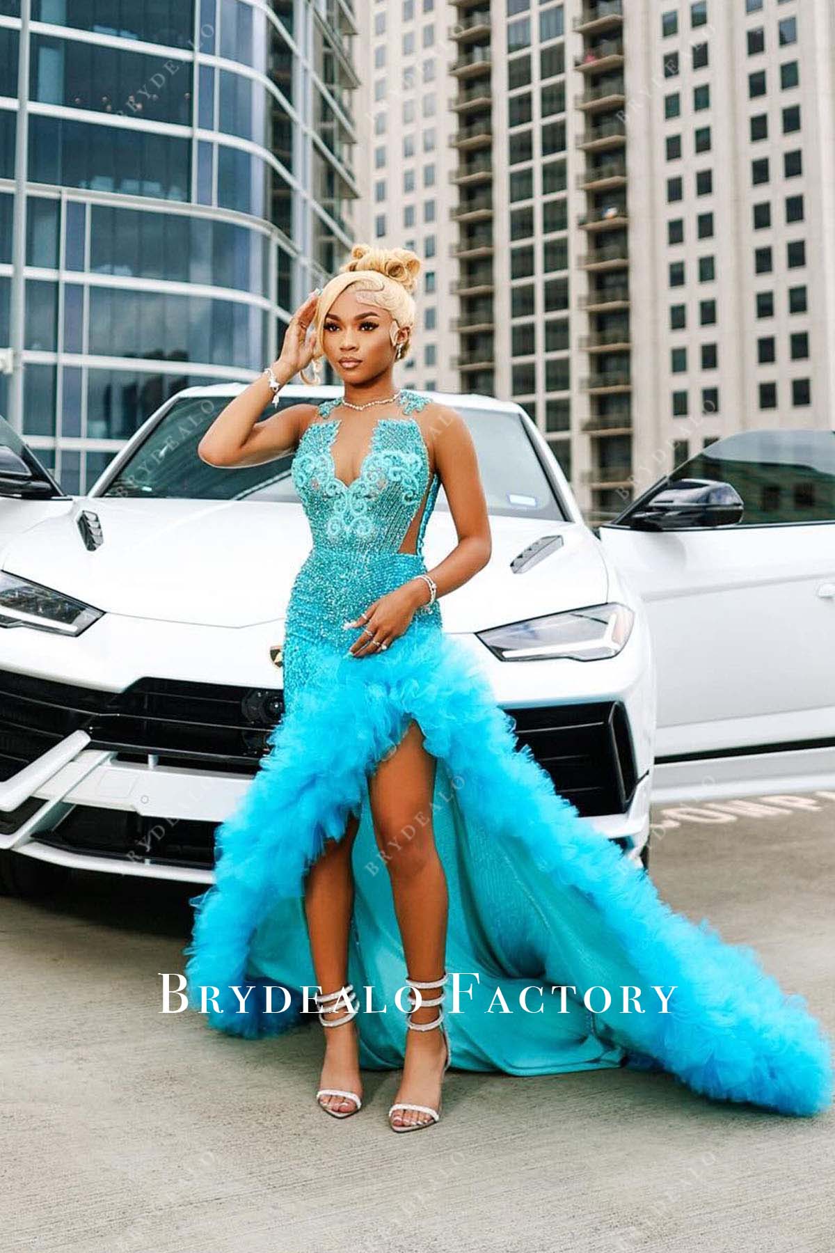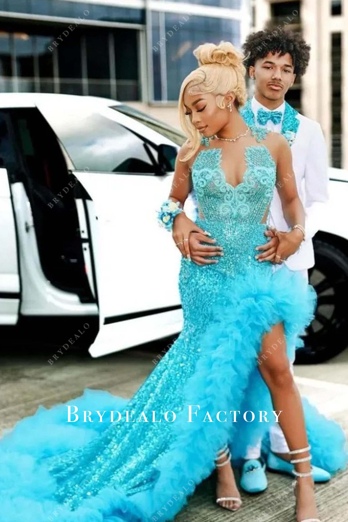 Dazzle in this pool-blue prom dress, featuring a rhinestone-adorned sheer neckline and sleeveless bodice. Sequins shimmer down to a thigh-high slit, while the long train with a ruffled tulle hem adds a touch of elegance and drama. Perfect for a striking, unforgettable prom look.