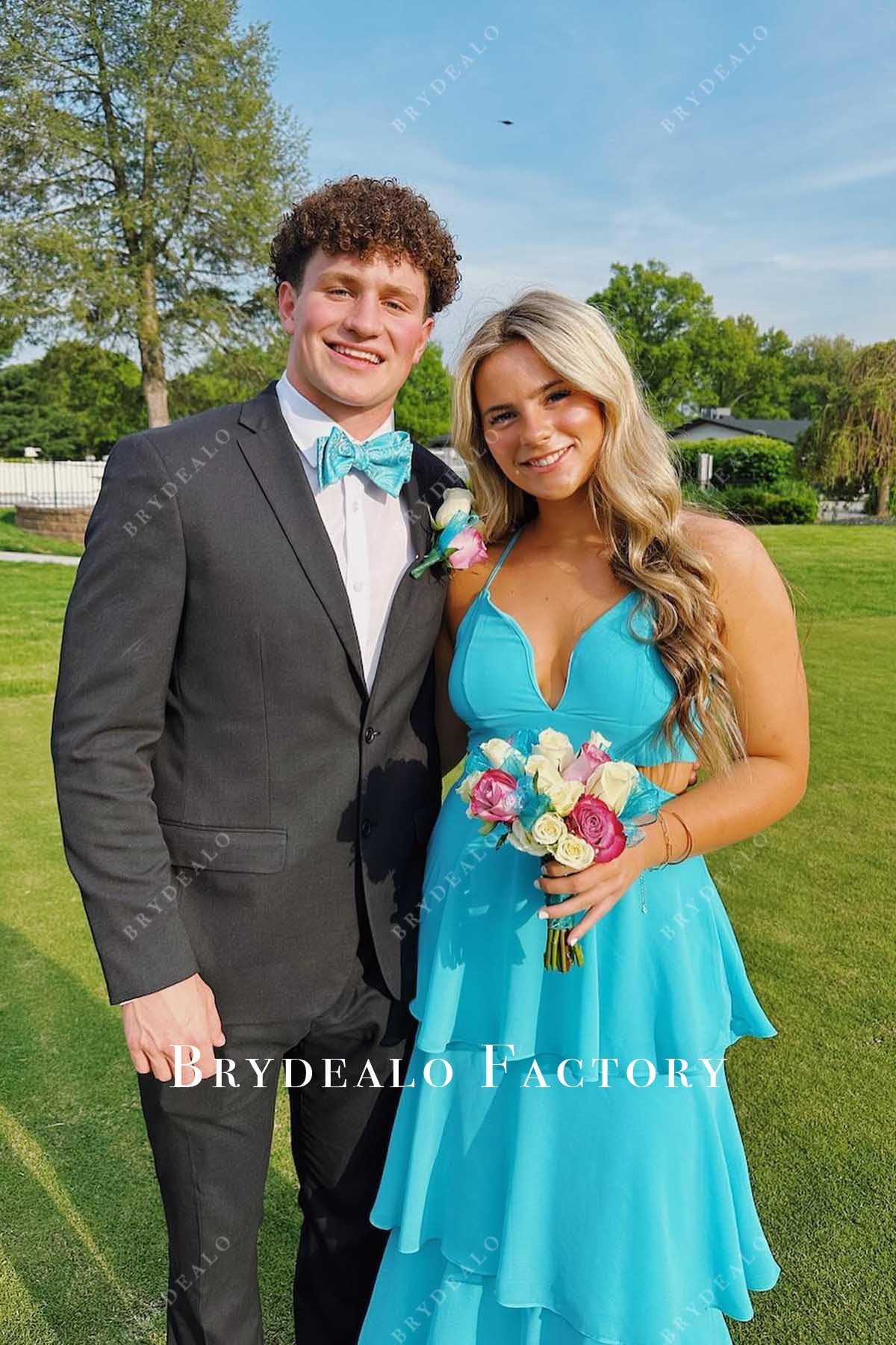 Turn heads at prom in this stunning pool blue dress! Featuring spaghetti straps, a flattering V-neck, layered A-line skirt, and trendy cutouts—this floor-length gown blends elegance and bold style for a show-stopping look.