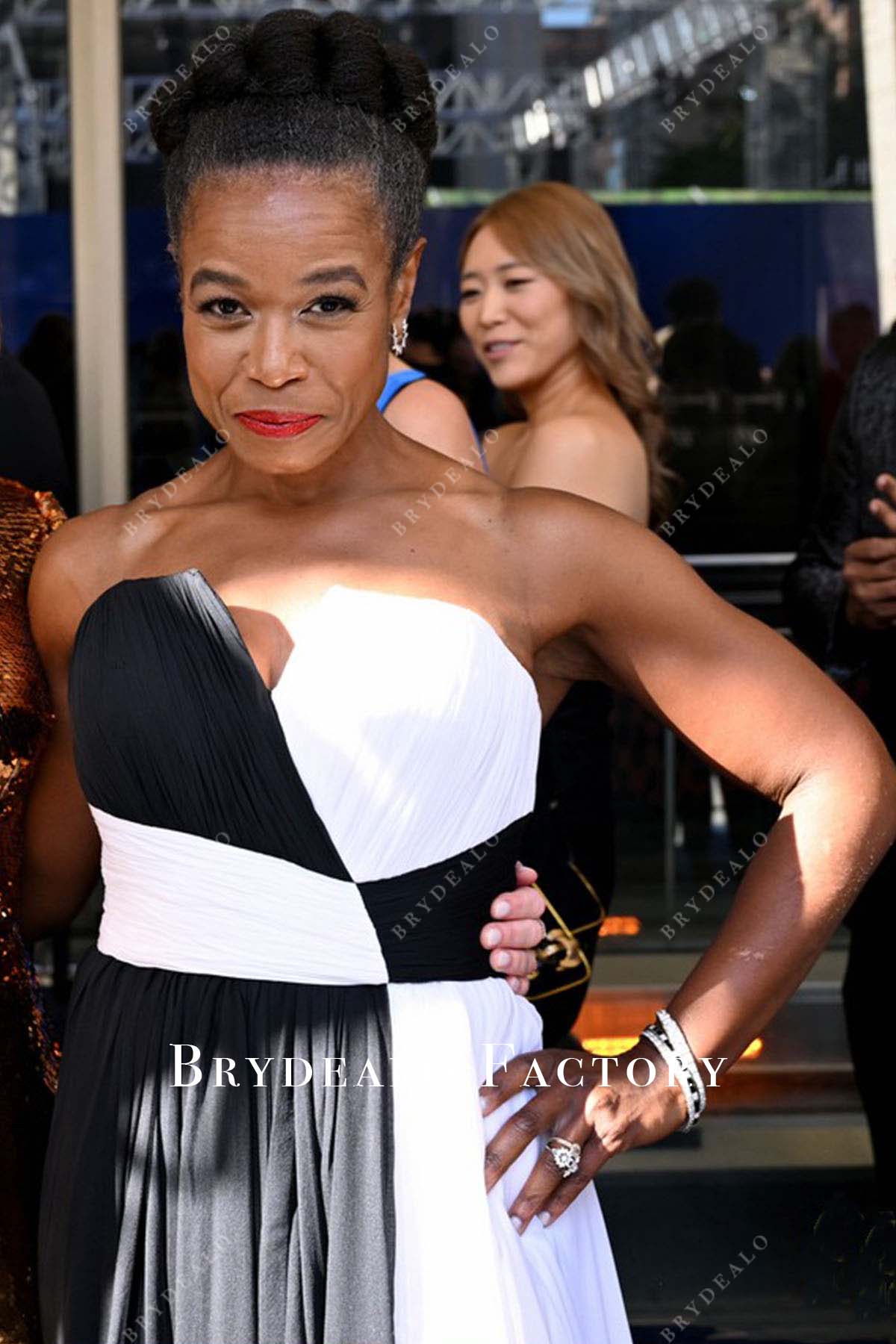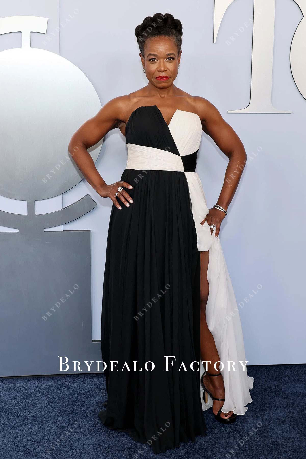 Quincy Tyler stuns in this two-tone black white celebrity dress at 2024 Tony Awards. This long prom formal gown features strapless V-neck bodice, A-line pleated slit skirt with sweep train.
