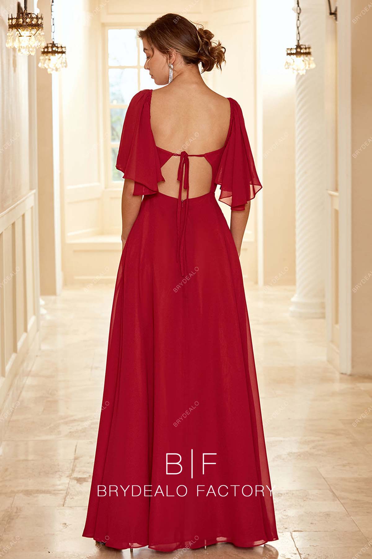 Red Chiffon Sheer Flutter Sleeves A-line Long Dress