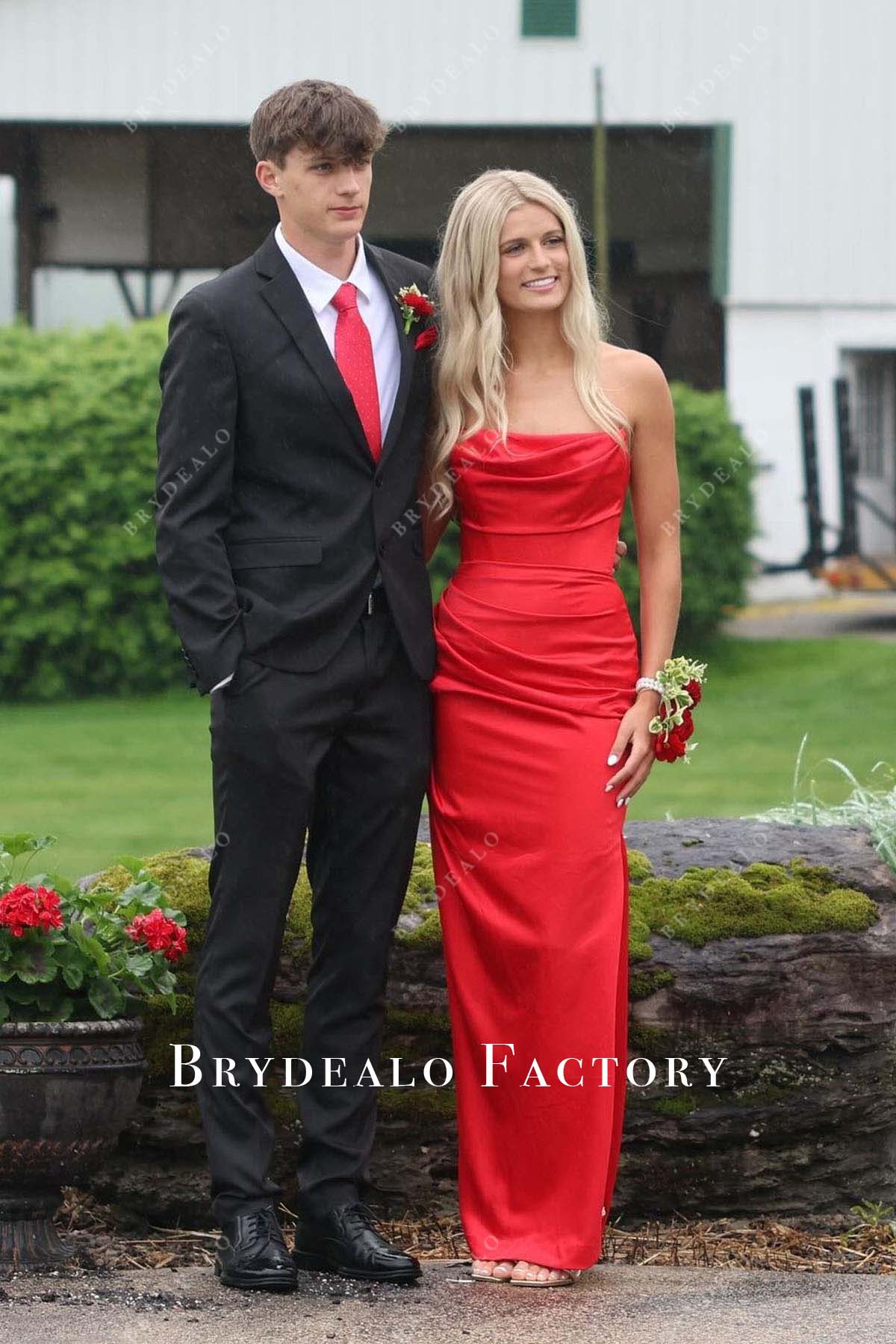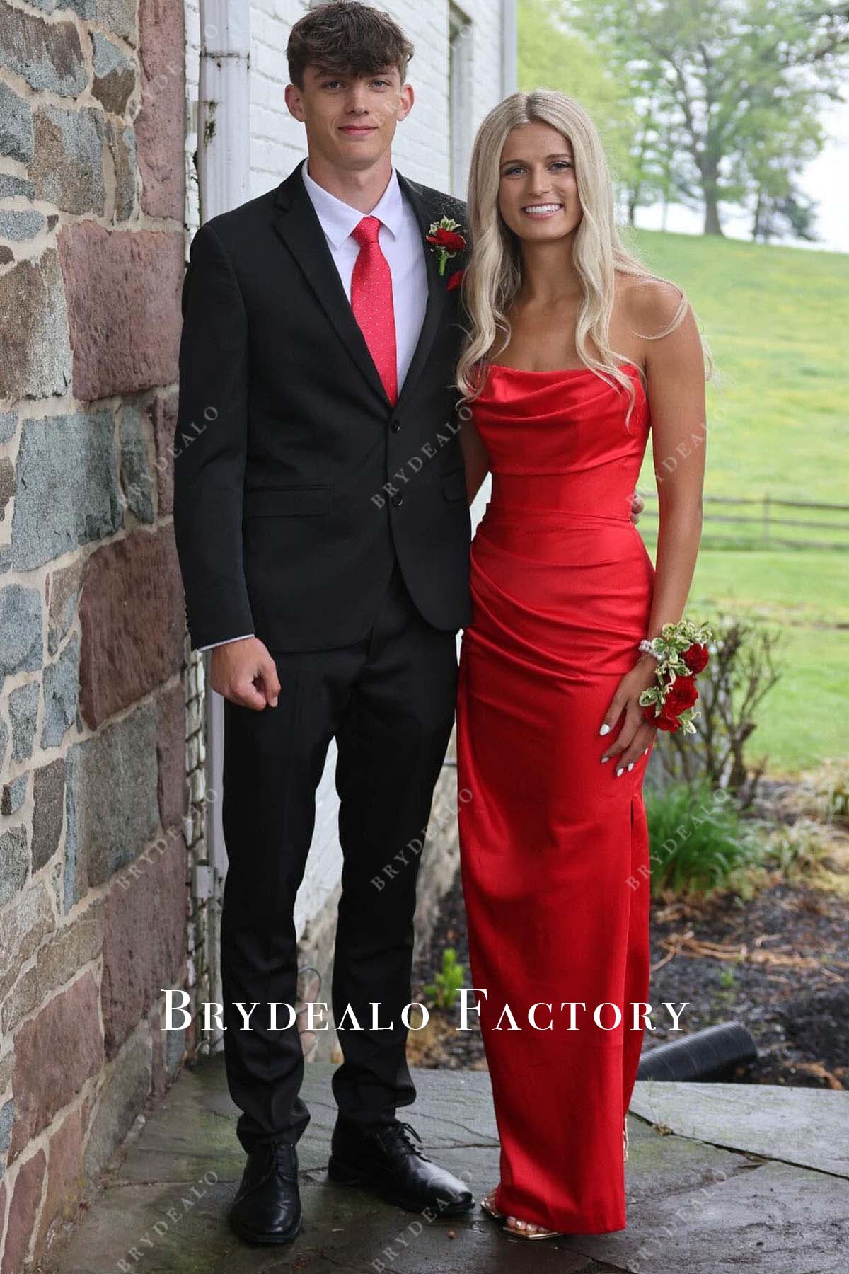 Turn heads in this red strapless homecoming dress. Featuring a straight-across neckline, pleated column design, and a daring floor-length slit for a sleek, elegant look. Perfect for making a bold statement at any event.