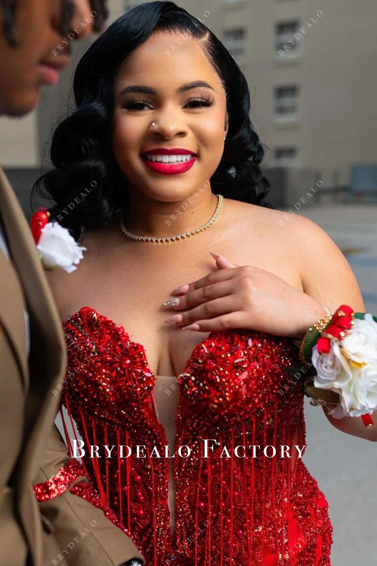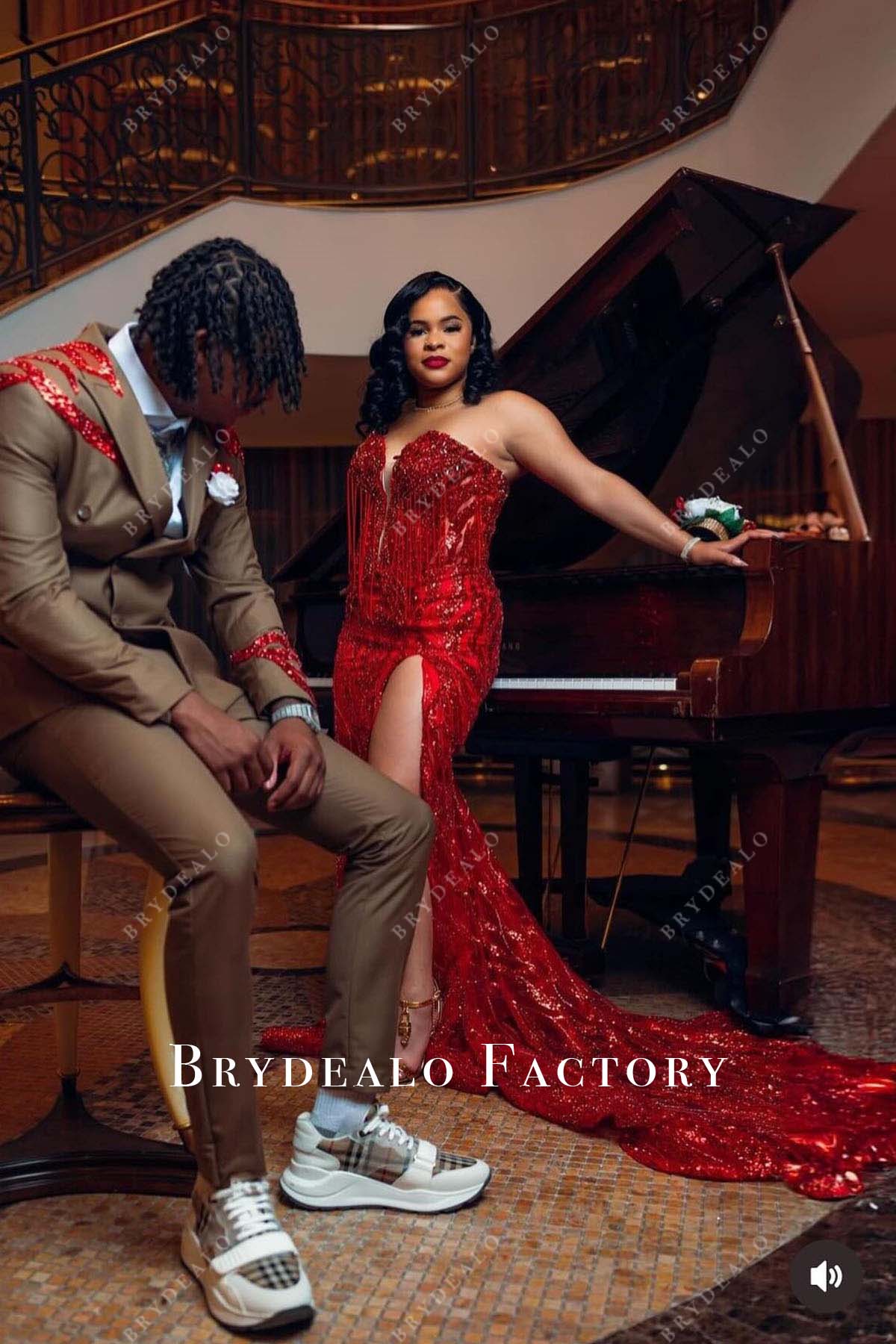 Turn heads in this striking red shimmer strapless prom dress, adorned with beading, crystals, etc.. Featuring a plunging sweetheart neckline, thigh-high slit, and a dramatic long train, this gown combines elegance and allure, making it the perfect choice for a glamorous and unforgettable evening.
