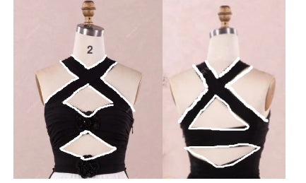 This halter neck sleeveless A-line prom dress is customized from royal blue satin without pleats & flowers, scattered with silver rhinestones. Featuring illusion nude tulle cutout scattered with rhinestones.