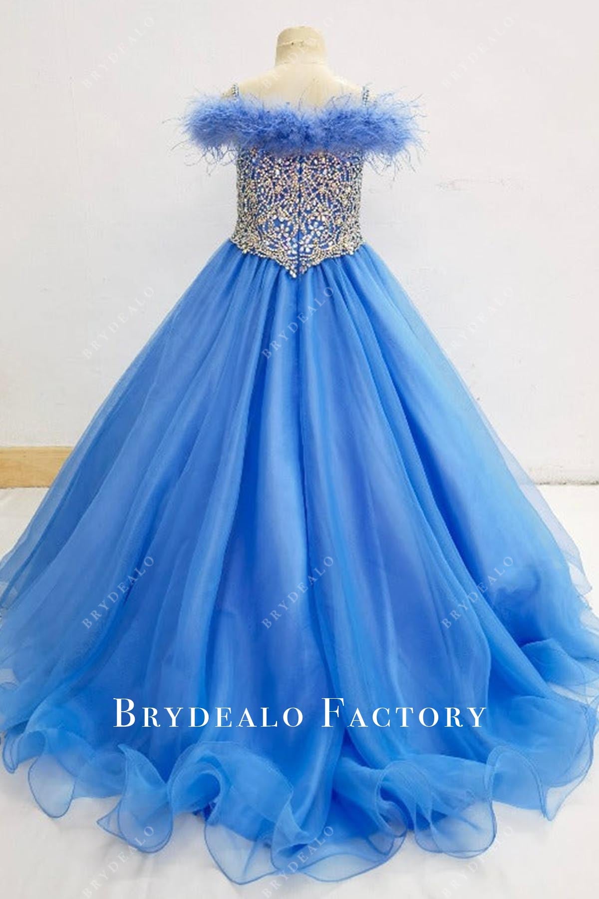 Make a grand entrance in this stunning blue pageant dress, featuring rhinestone embellishments, cold shoulder sleeves, and a feathered neckline. The Basque waist creates a flattering silhouette, while the A-line skirt and court train add regal elegance.