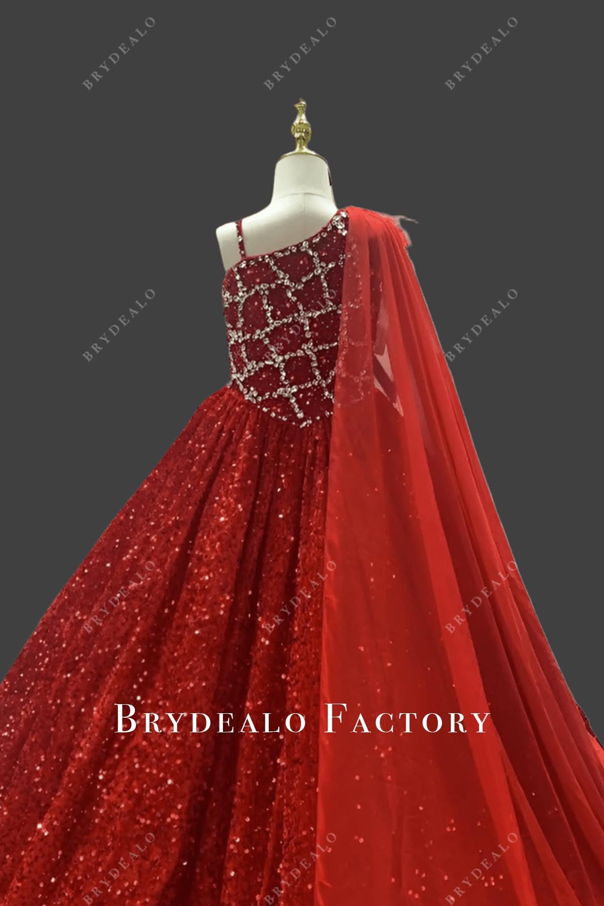 Shine bright in this red glitter kids pageant dress, featuring an asymmetrical neckline, dazzling rhinestones, and a flowing A-line silhouette. The long cape and elegant court train add extra drama.