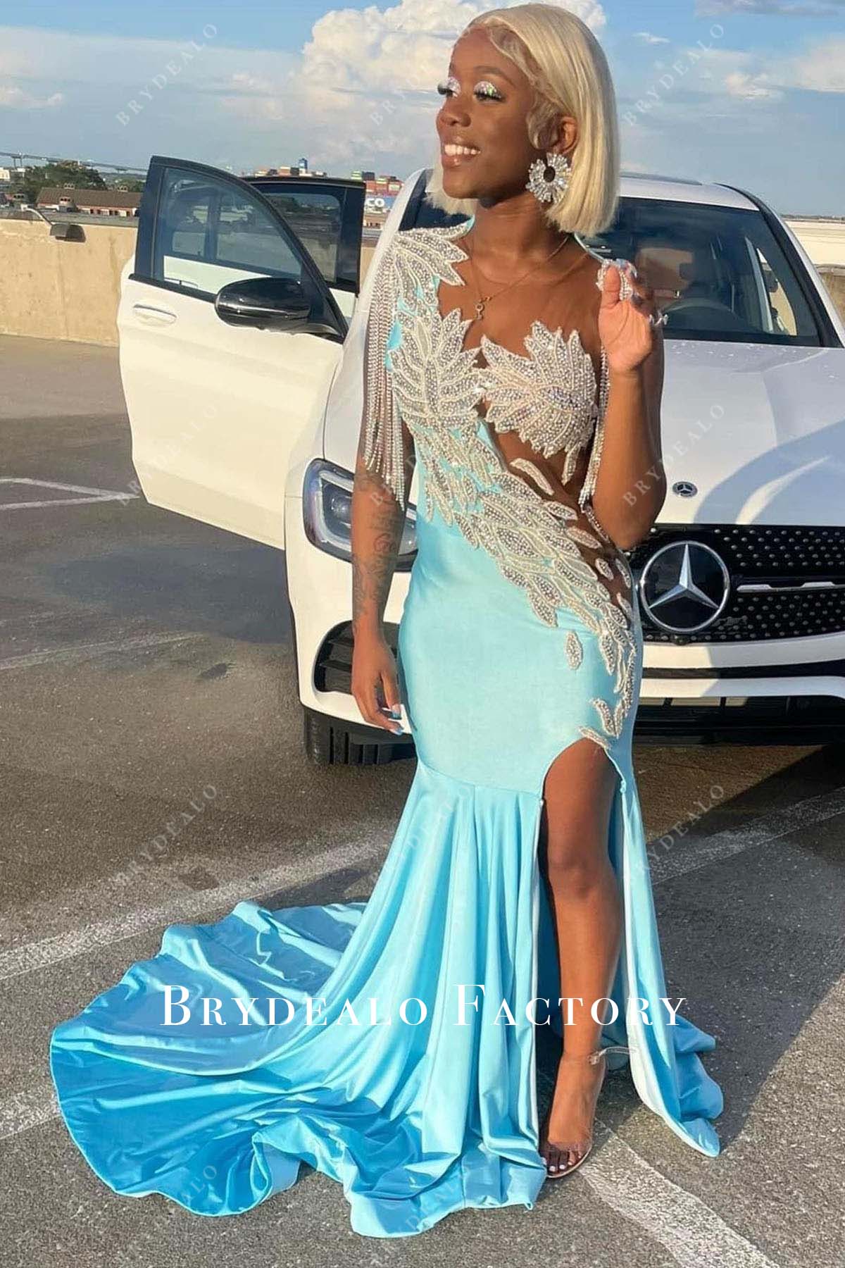 Capture attention in this elegant pool blue prom dress, featuring a figure-hugging silhouette and a dramatic high slit. Intricate silver leaf-like embellishments adorn the bodice and one shoulder, adding a touch of glamour. The unique one-sleeve design with delicate fringe detailing enhances movement for a chic, sophisticated look.