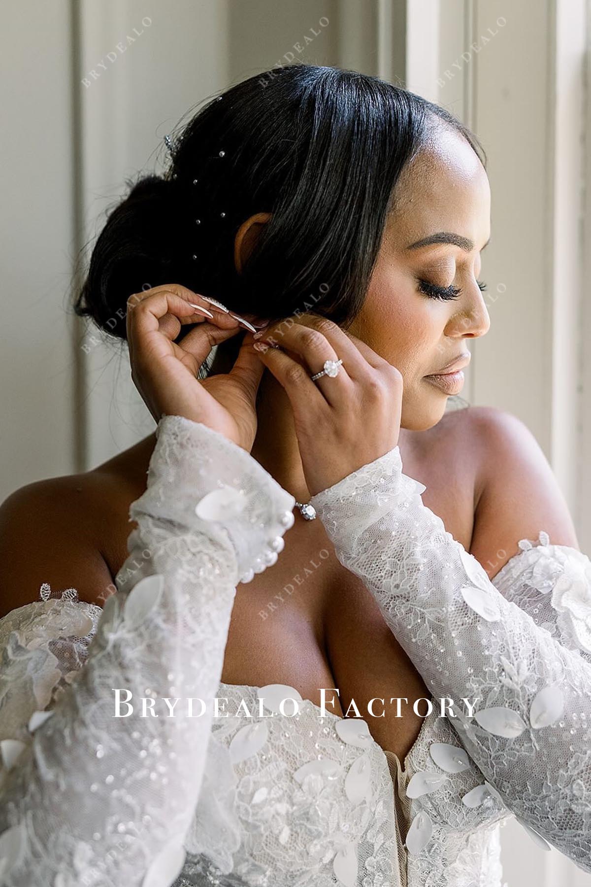 Embrace elegance in our Romantic 3D Lace Off-Shoulder Wedding Dress. With long sleeves, a V-neckline, and a stunning mermaid silhouette with chapel train, it's pure bridal magic.