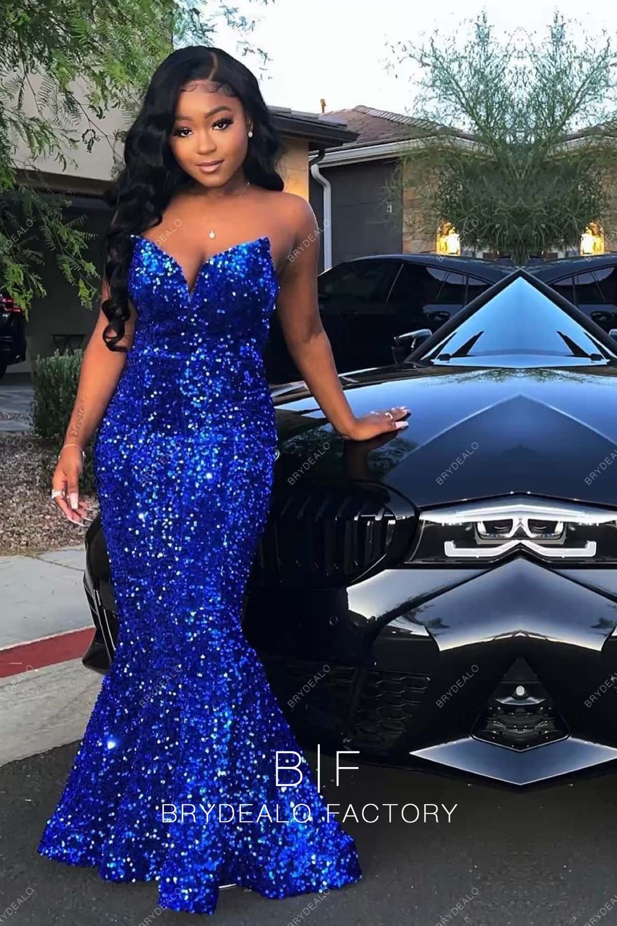 Floor Length Royal Blue Stretchy Sequins Mermaid Strapless Prom Dress