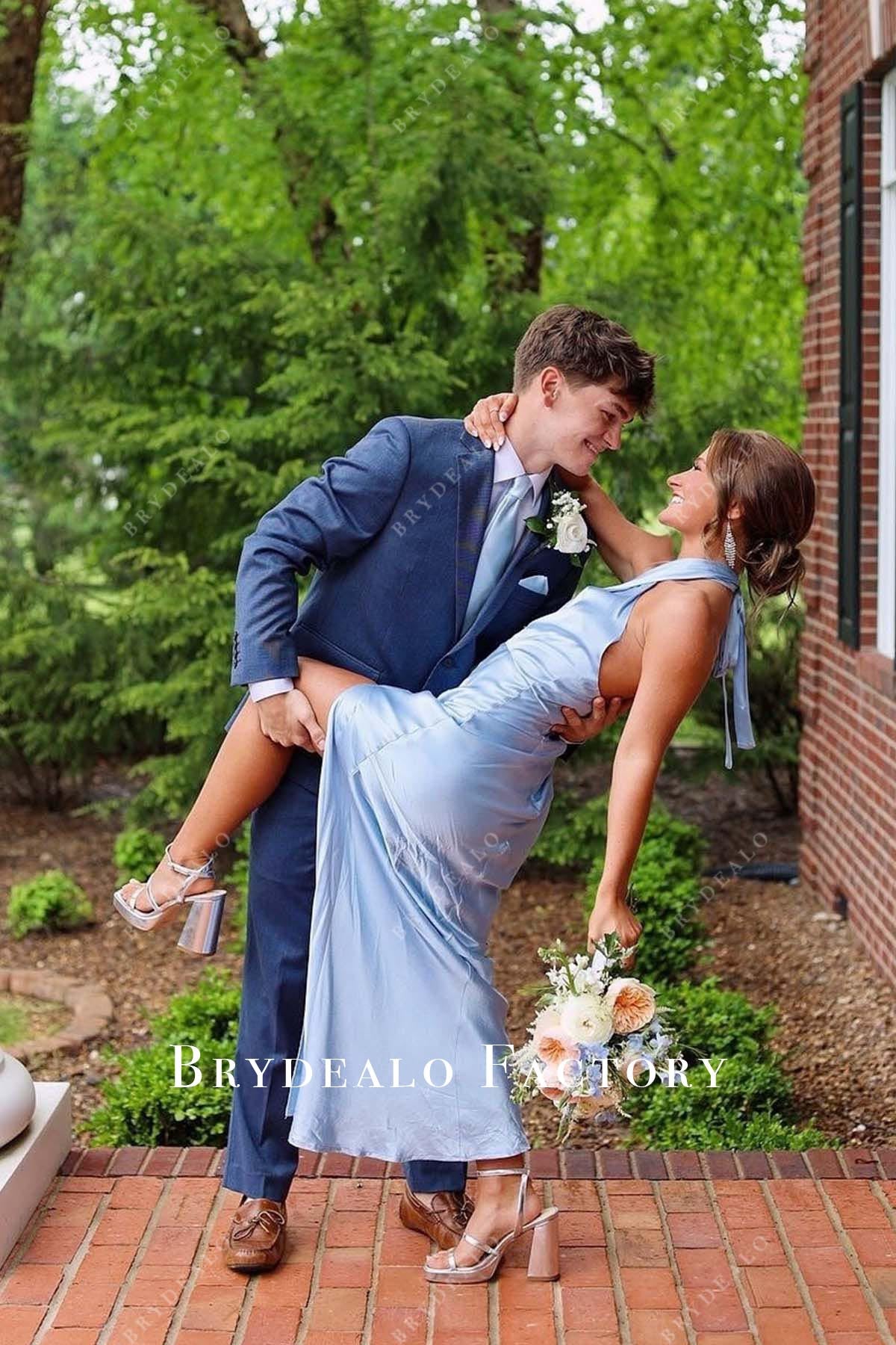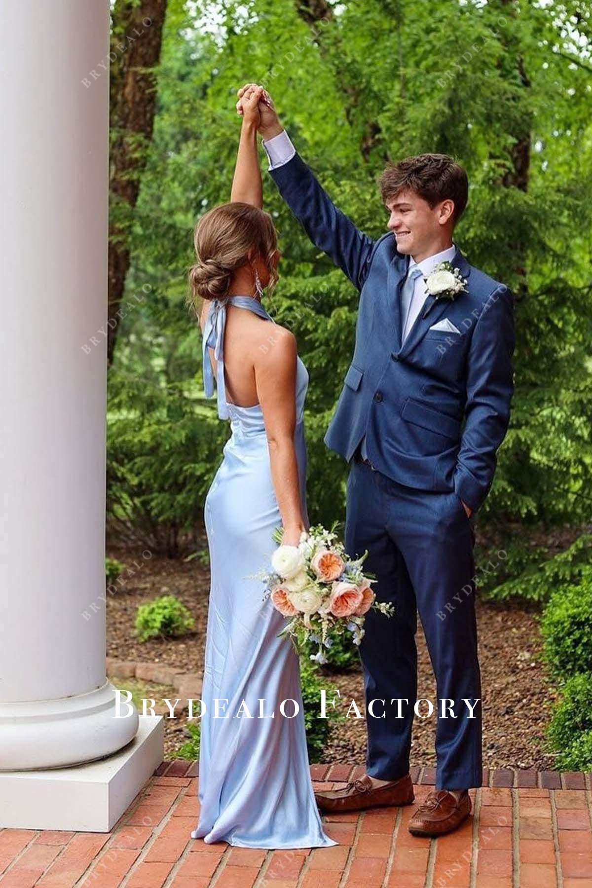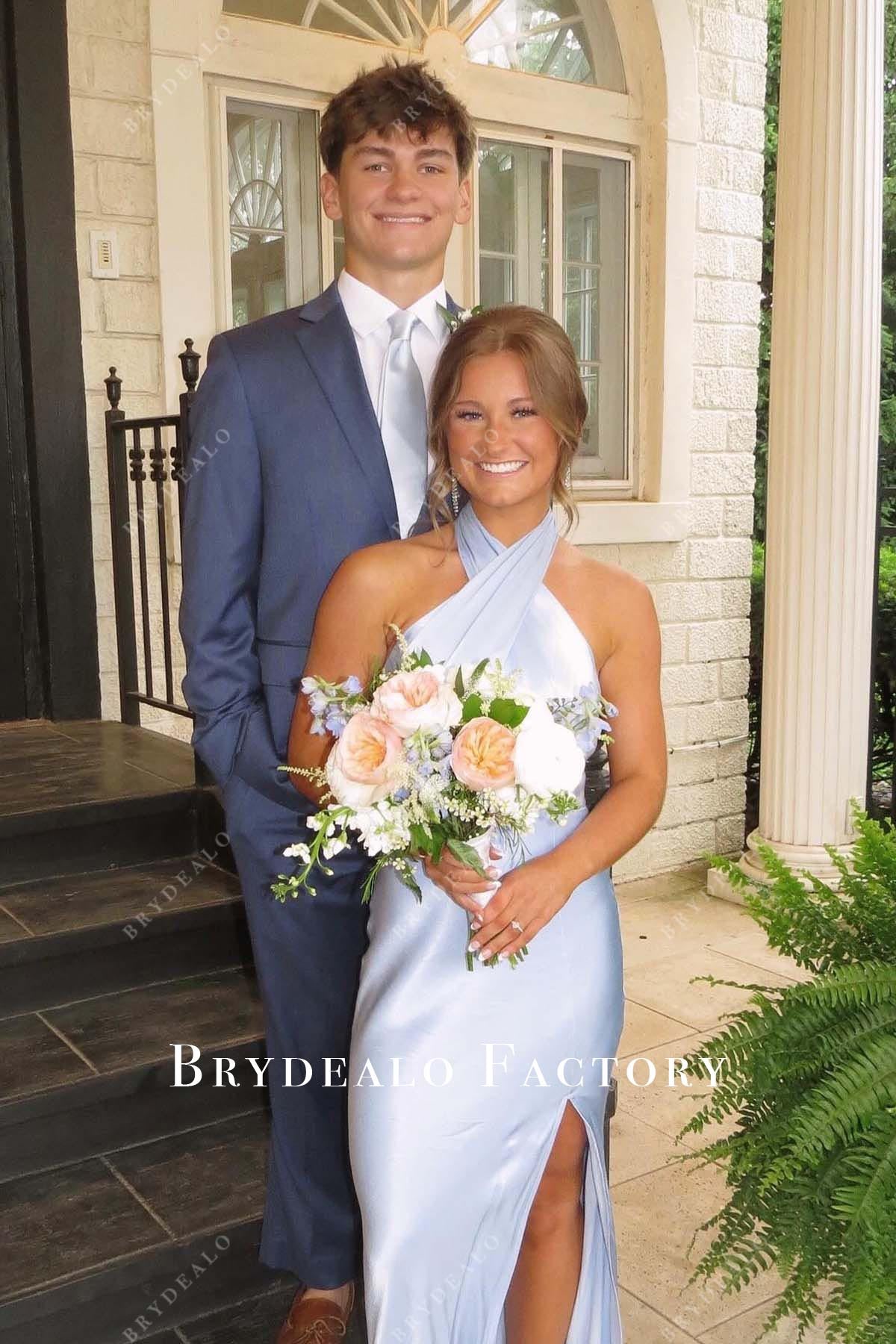 Sky Blue Halter Slit Fit And Flare Floor Length Prom Dress