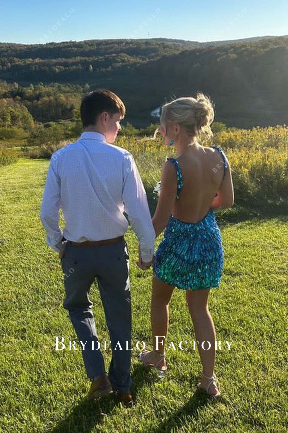 Homecoming Dress | Sparkly Blue Sequined Deep V-Neck Mini Formal Gown