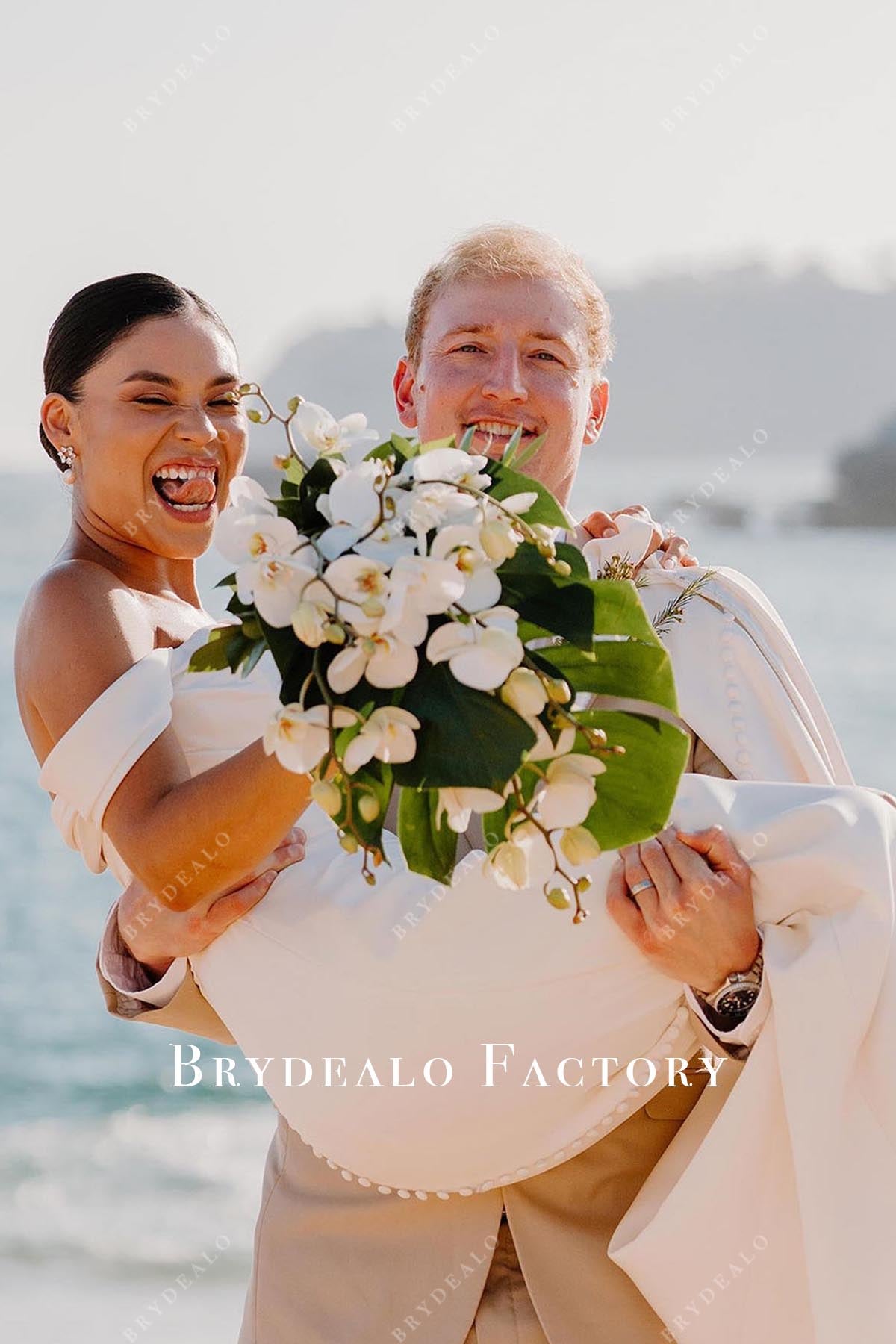 Stun in this off-shoulder mermaid wedding dress featuring a chic cowl back, thigh-high slit, and flowing chapel train. Elegant and modern, it’s the perfect blend of romance and allure for your big day.