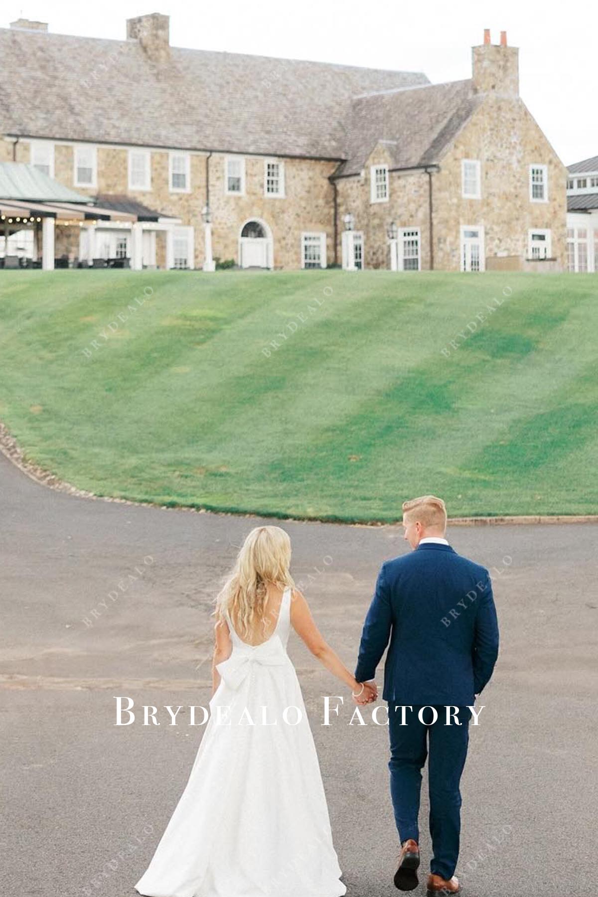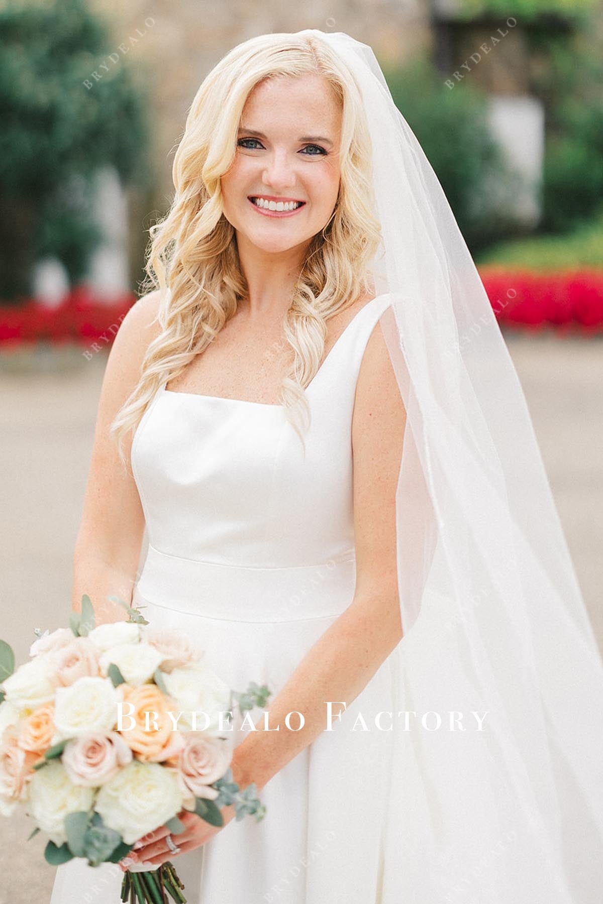 Grace your big day in this timeless A-line wedding dress featuring wide straps, a square neckline, elegant court train, and a charming bowknot at the back.